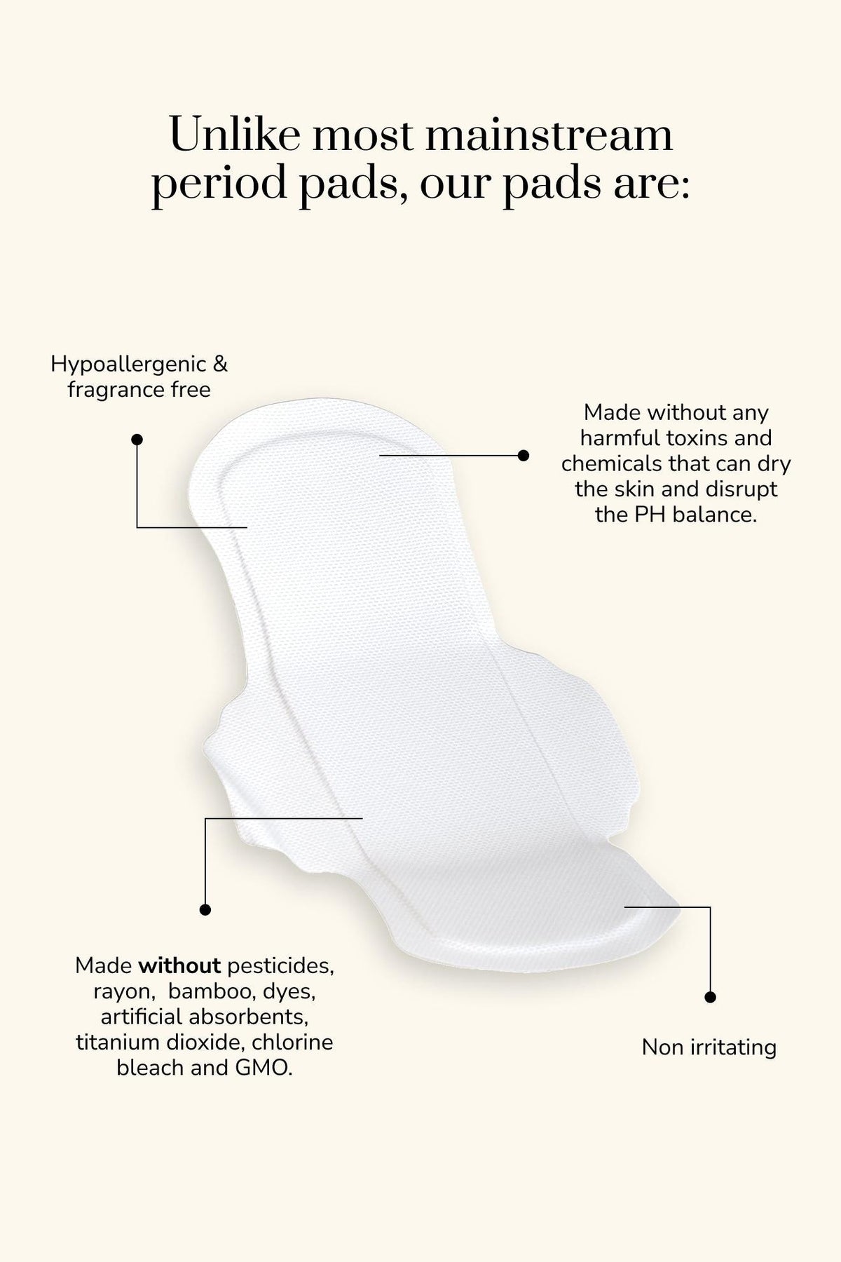 Free from chlorine bleach, rayon, bamboo, titanium dioxide, dyes, GMOs, and other harsh chemicals
