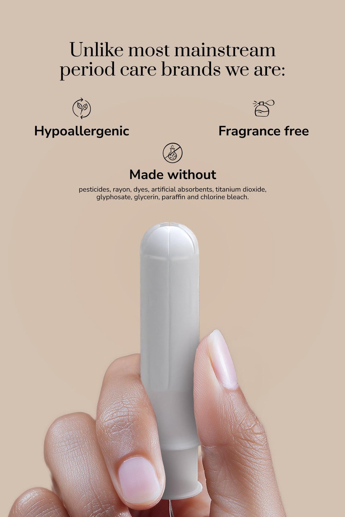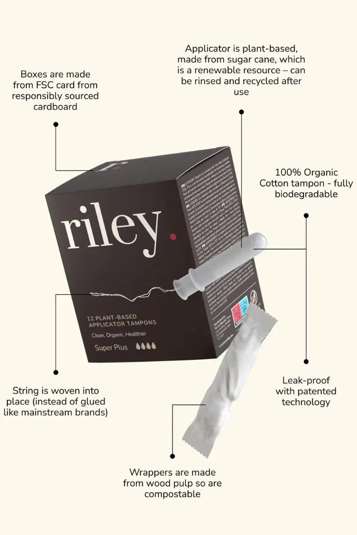 Our Riley Super Absorbency Organic Cotton Applicator Tampons are made with 100% certified organic cotton - no pesticides, no rayon, no hidden toxins. The string is woven directly into the tampon, not glued like mainstream brands, so you’re only putting natural fibres where they belong.