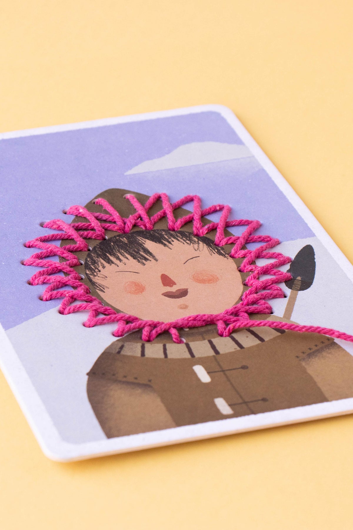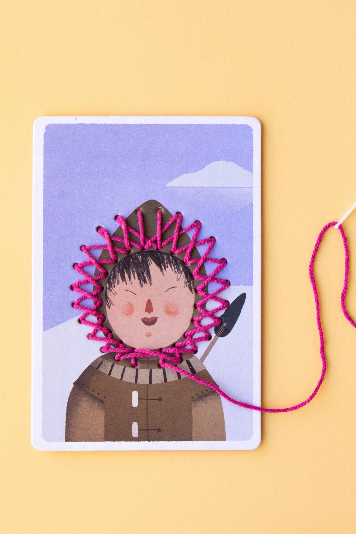 Sew your way into a world of adventure! Stitch together the images of a brave sailor who has travelled the seven seas, a fearless Eskimo, a wild wolf, and an Indian with the peace pipe.