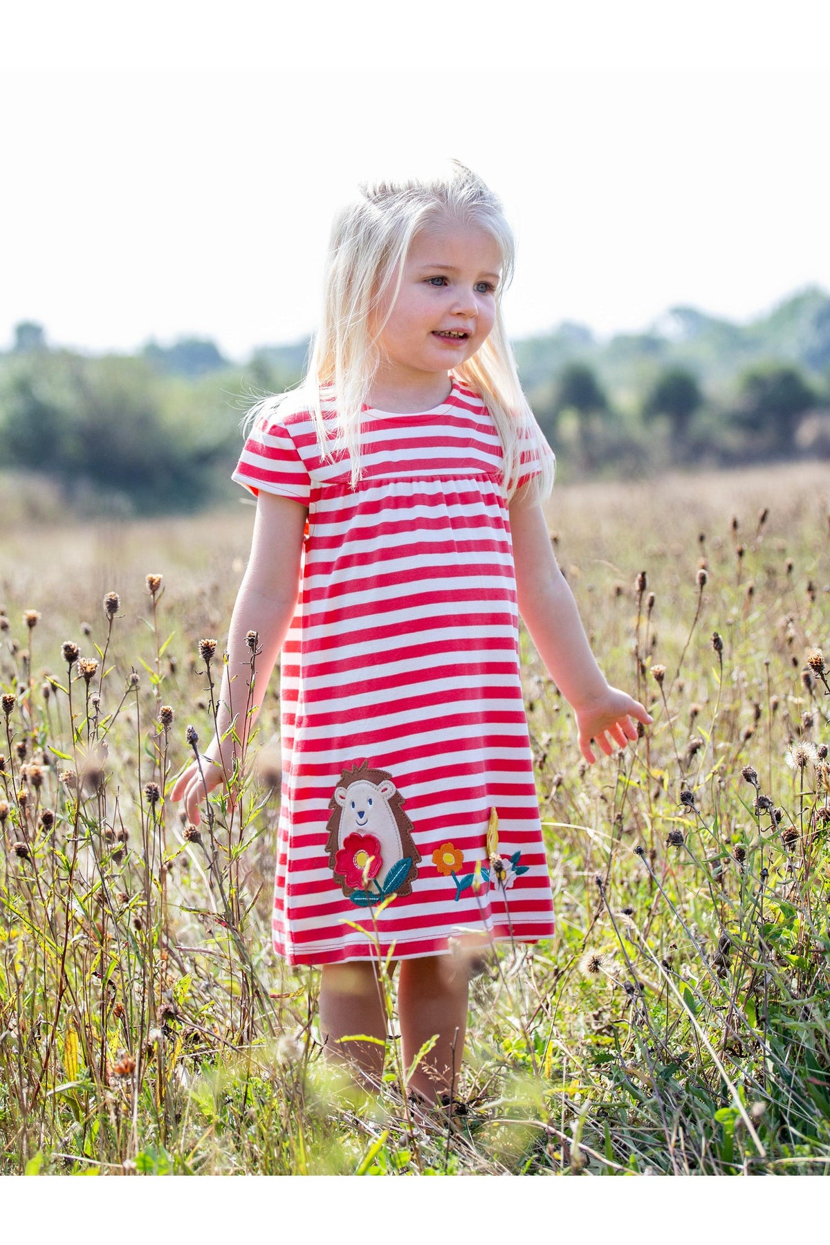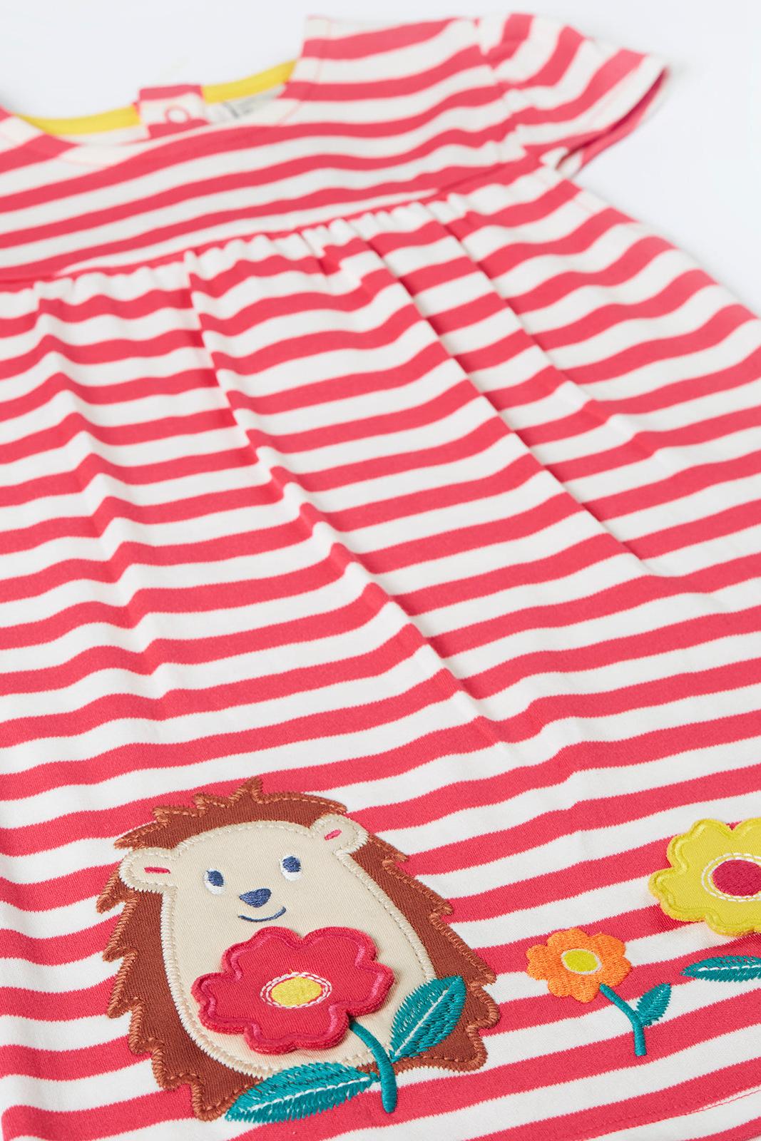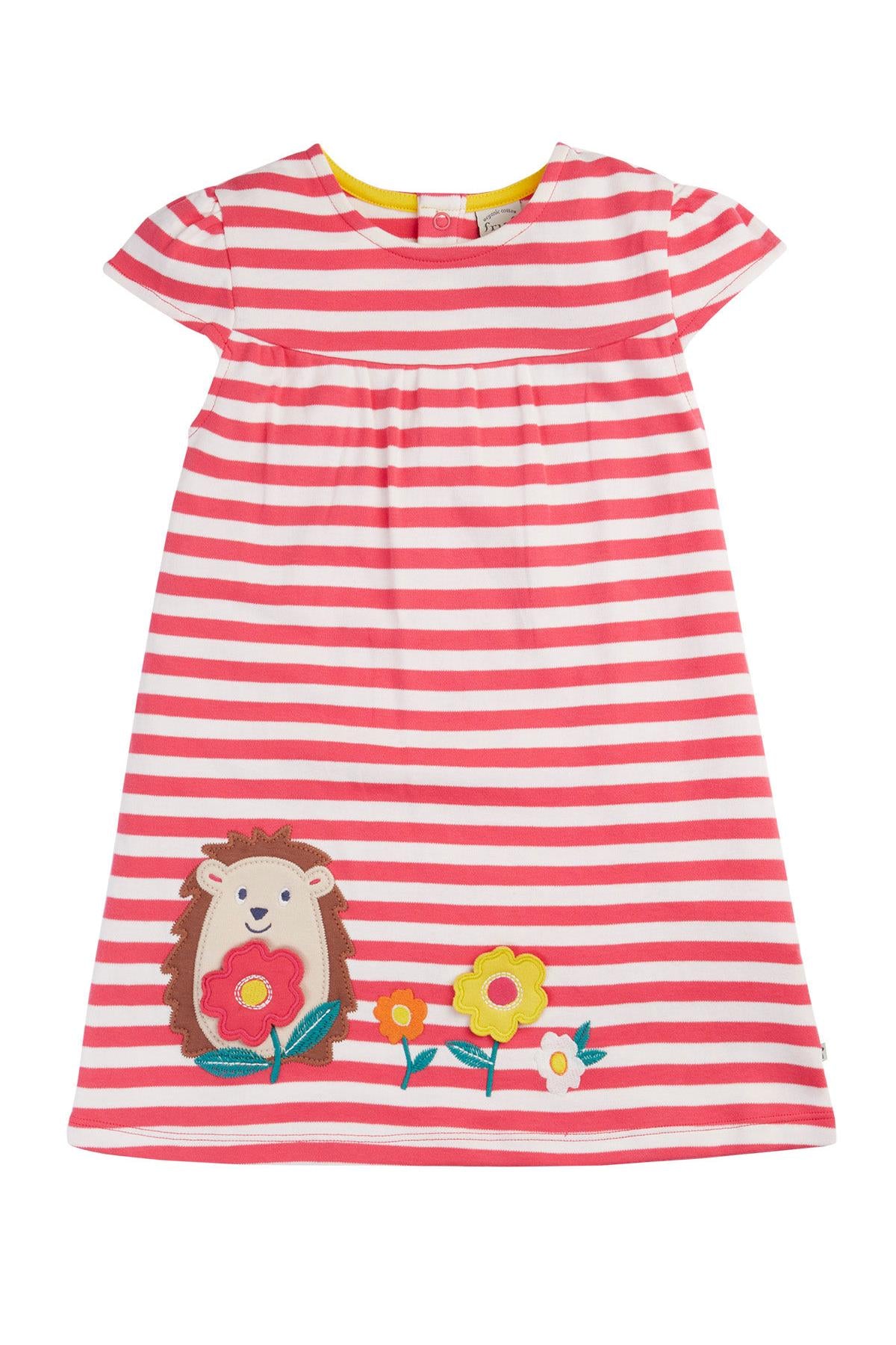 Frugi Little Layla Dress in Rhubarb Stripe/Hedgehog