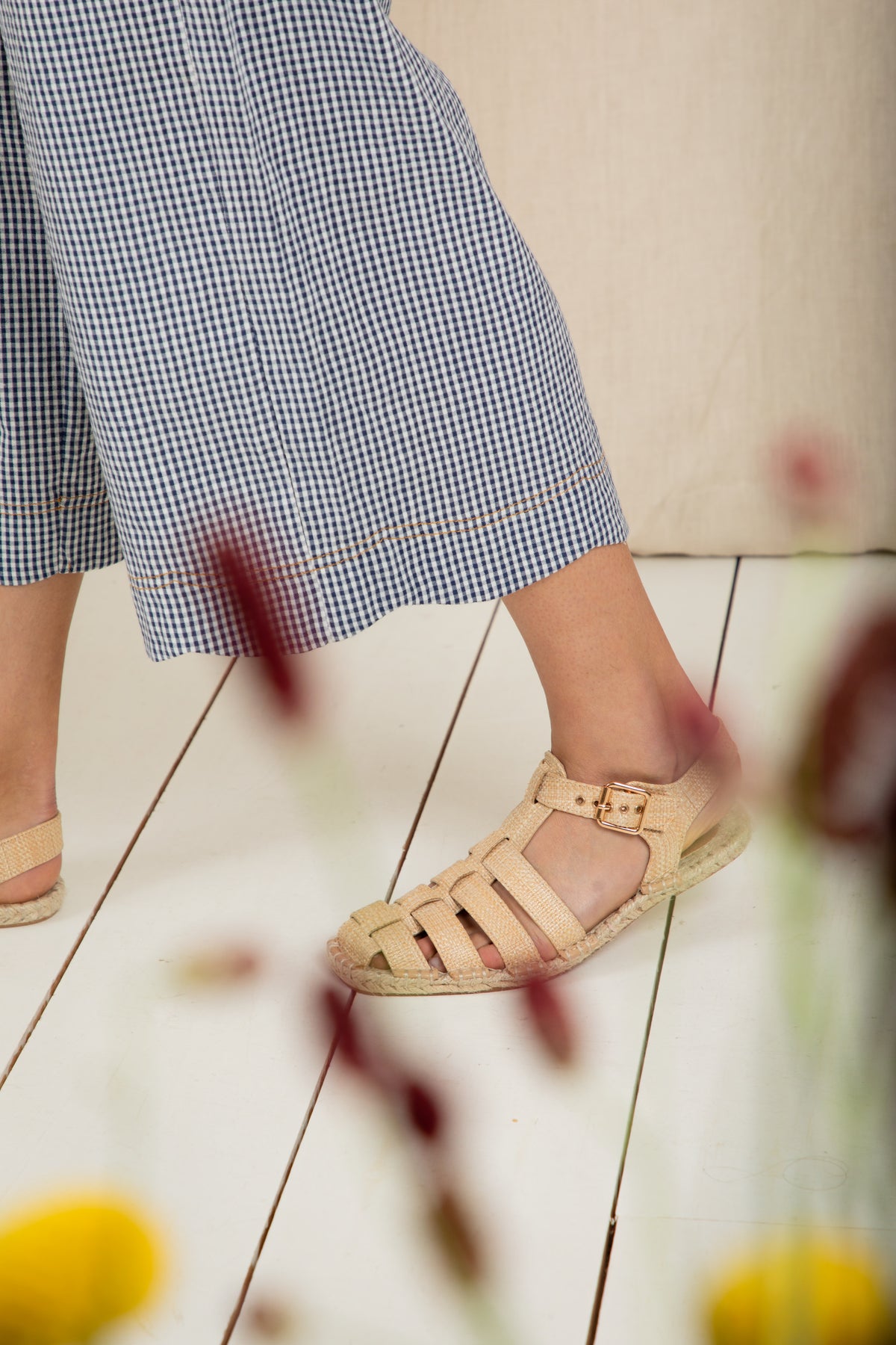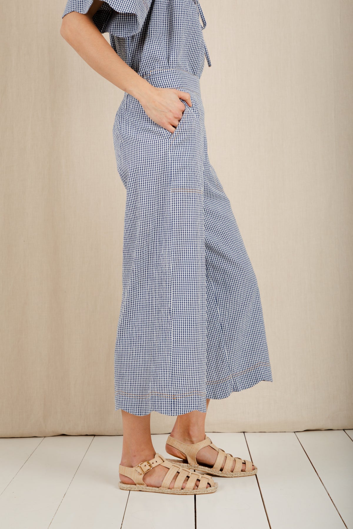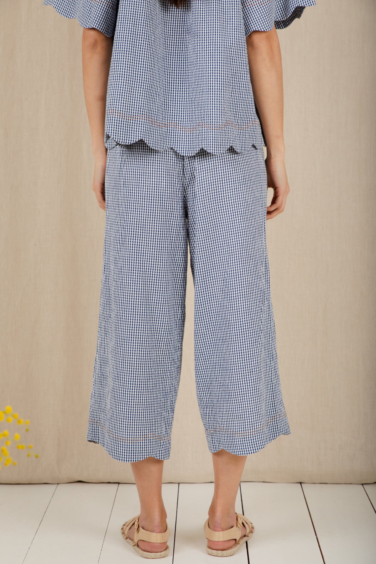 Relaxed, loose-fitting 3/4 length trousers in soft organic cotton seersucker gingham. Featuring a wide-leg silhouette, elasticated back, and delicate scallop hem for a feminine touch.