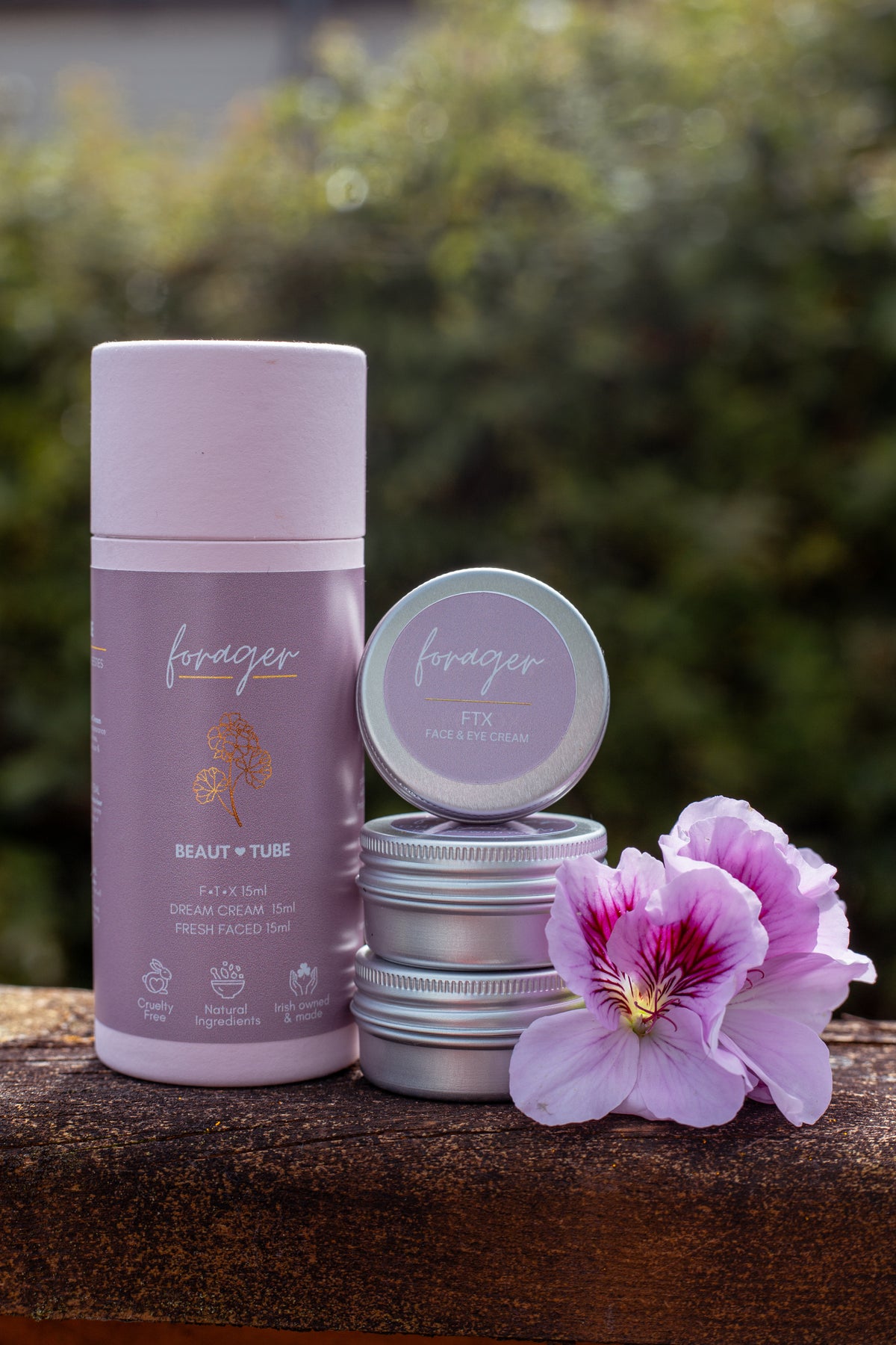 Forager beauty products on a wooden surface with a blurred natural background