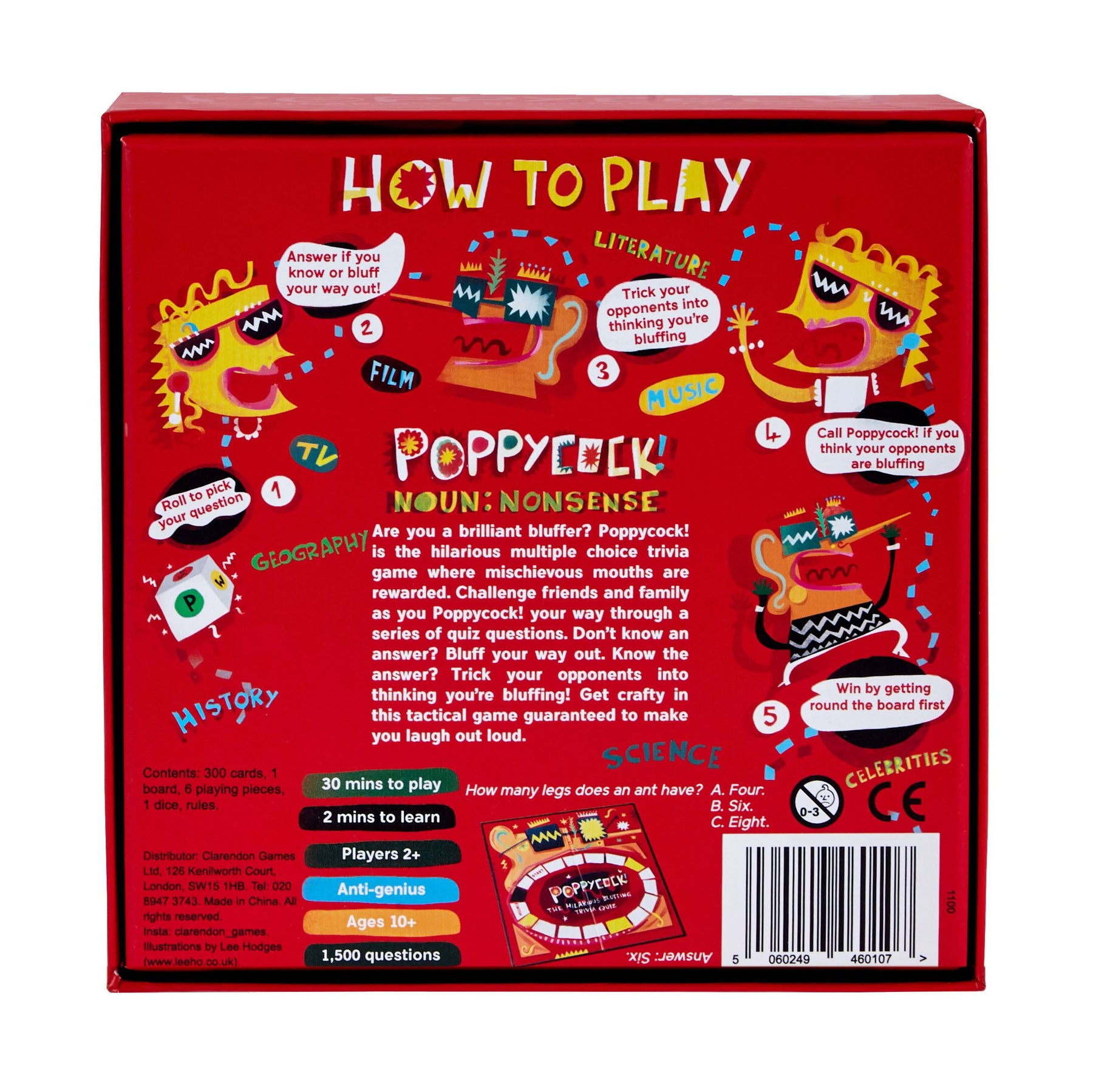 Put your knowledge and bluffing skills to the test with Poppycock!, featuring 750 trivia questions to challenge and entertain players of all ages. Quick to learn and fast to play, this game offers hours of fun with friends and family. Perfect for game nights, parties, or any gathering, Poppycock! is suitable for 2+ players, ages 10 and up, with gameplay that takes just 20 minutes.