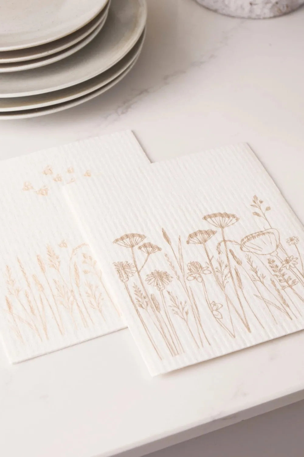 Compostable dishcloths with floral designs on a white surface with plates and a mug.