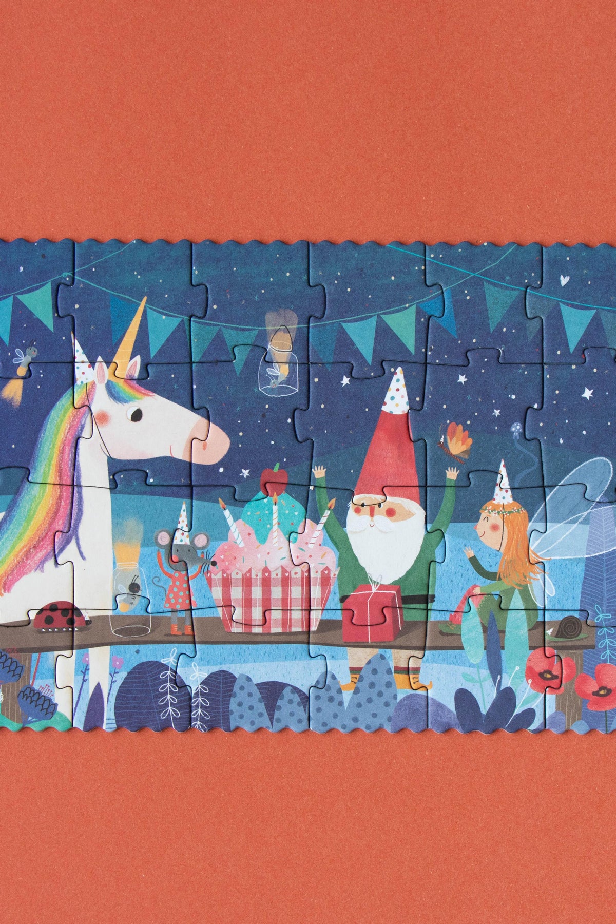 Tonight, as the sun sets, it’s time to celebrate the unicorn’s birthday! Piece by piece, the party comes together and once the puzzle is complete, the fun continues as we search for all the little details hidden in the scene.