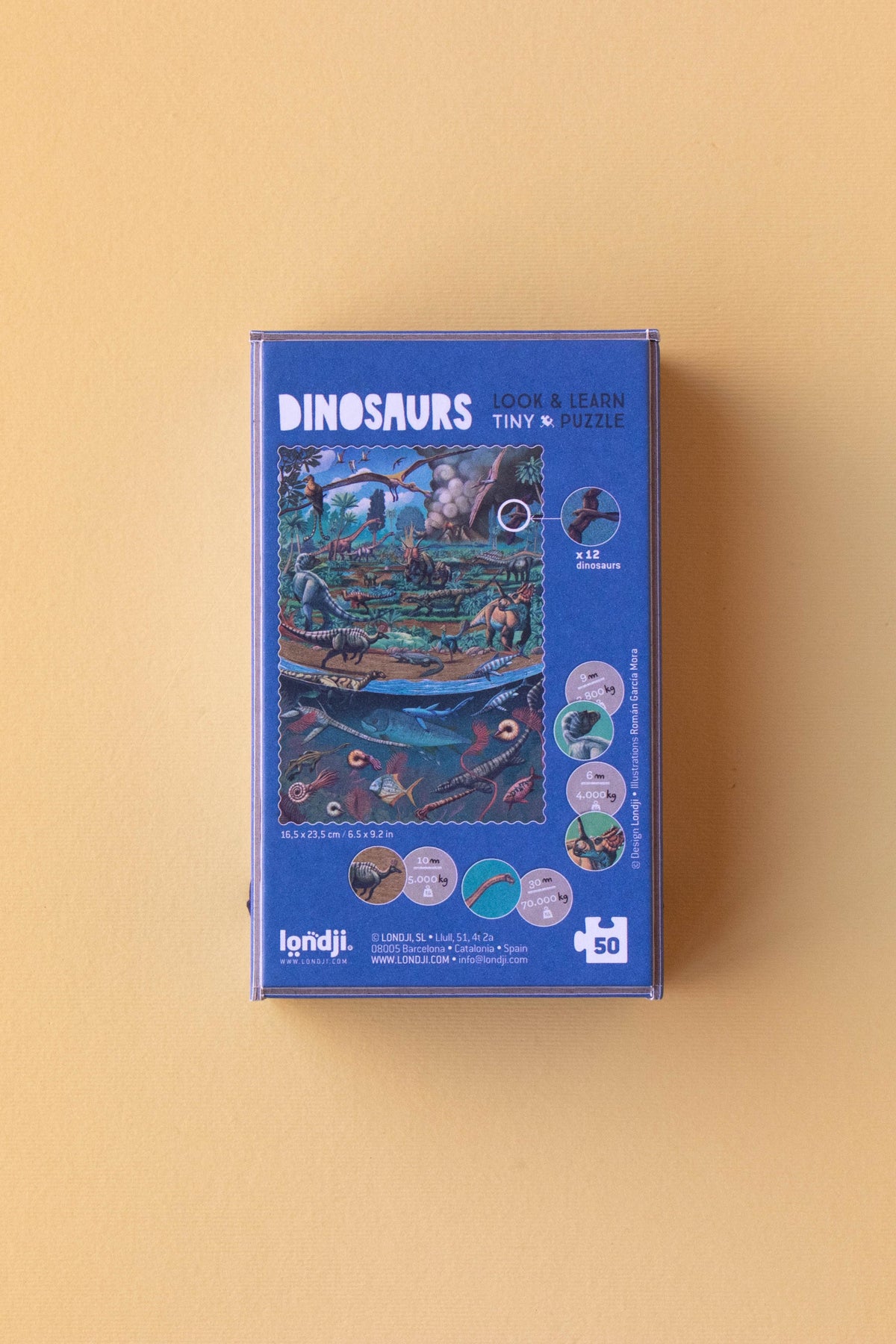 A small 50-piece puzzle that includes 12 pieces to learn about dinosaurs. An educational, sustainable toy made in Europe, locally crafted near Barcelona.