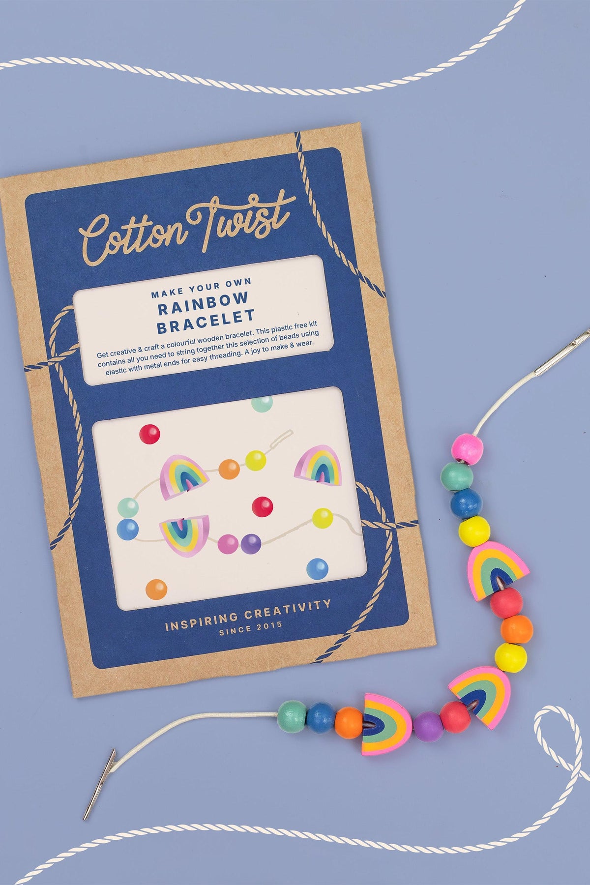 Suitable for ages three and up, this sustainable Make Your Own Rainbow Bracelet Kit is a fun activity for birthday parties or creative play at home. Cotton Twist craft kits are often gifted as party bag fillers, birthday presents, stocking fillers, or rainy-day activities.