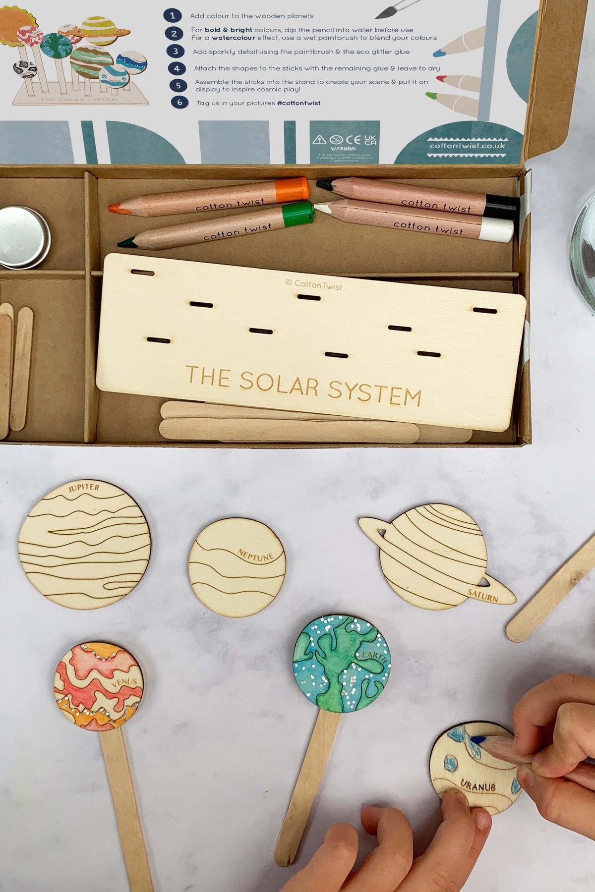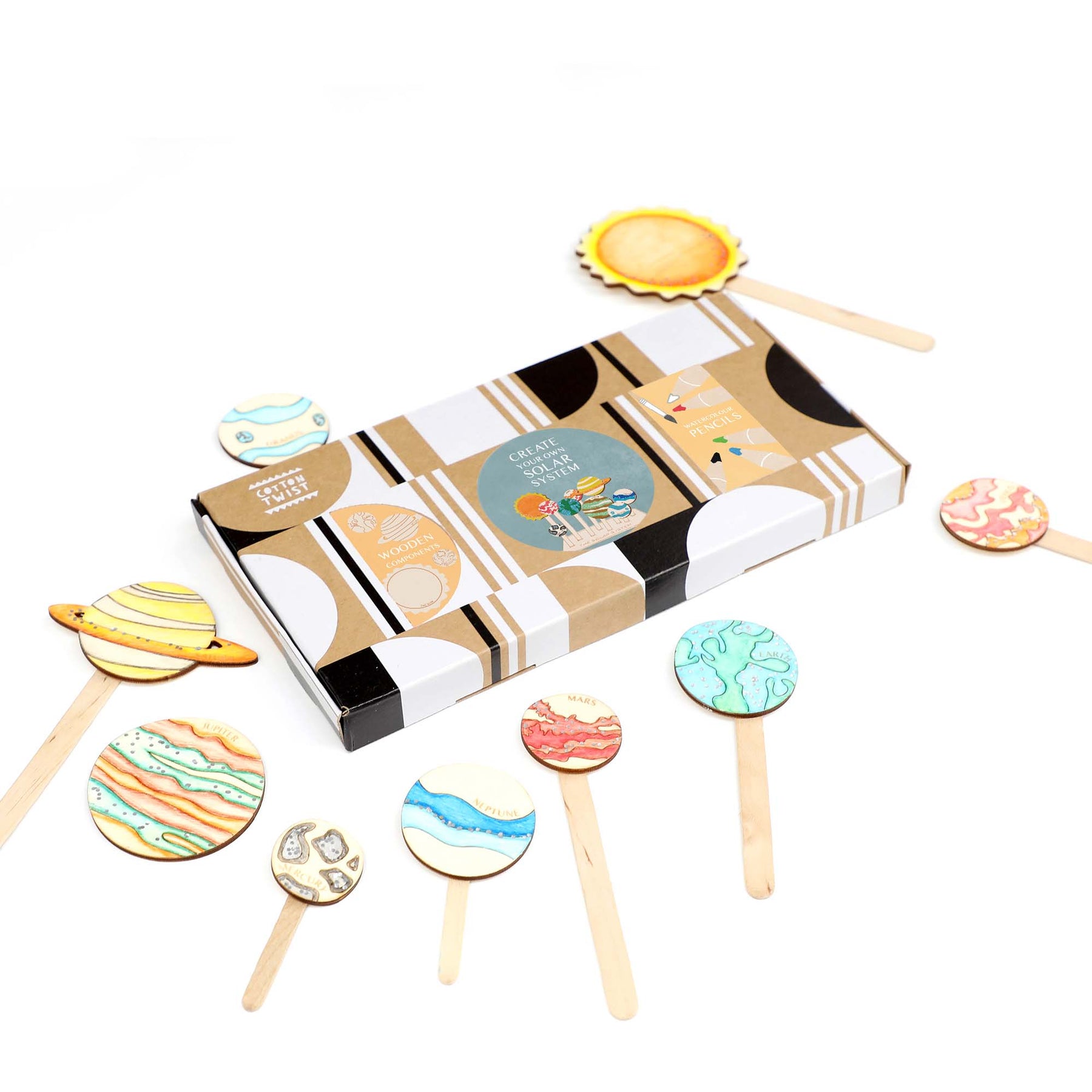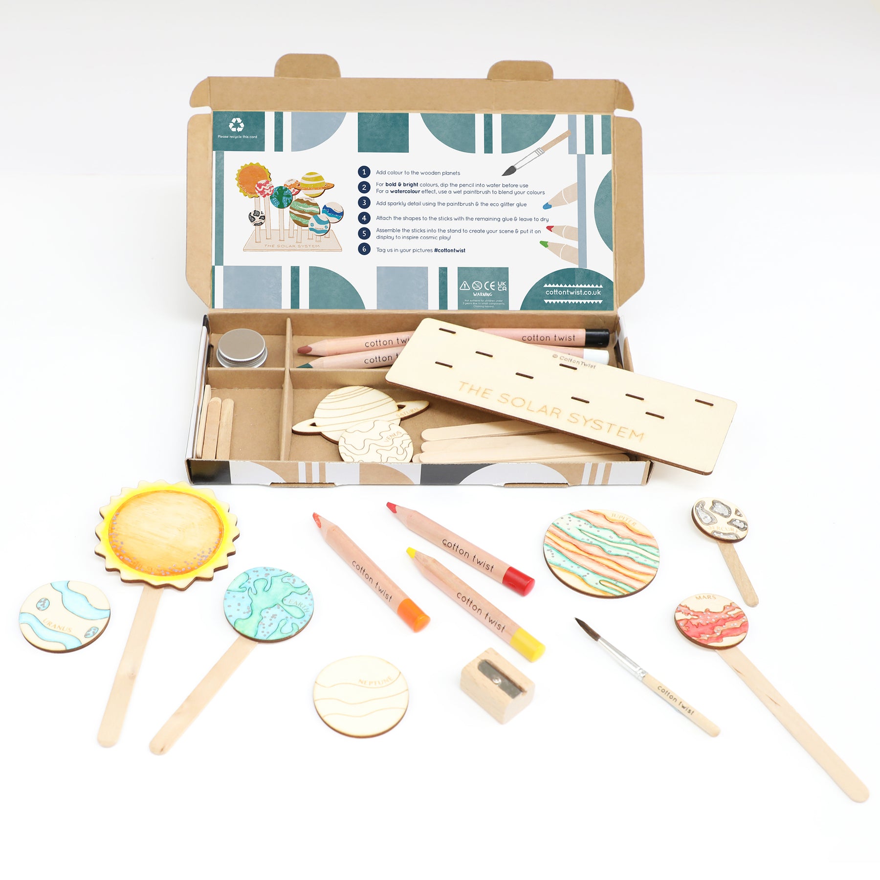 Plywood cut outs, wooden lolly sticks, solar system stand, watercolour pencils, wooden paintbrush, instruction card. UKCA/UKNI/CE tested & marked