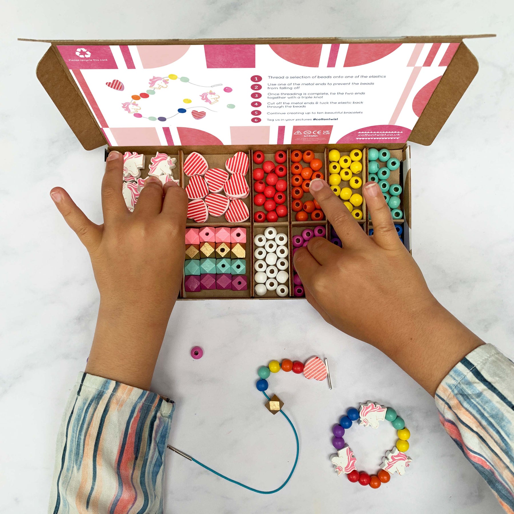 MATERIALS: Box, wooden heart beads, wooden unicorn beads, wooden geometric beads, spherical wooden beads, 10 elastics with metal ends for easy threading. UKCA/UKNI/CE tested