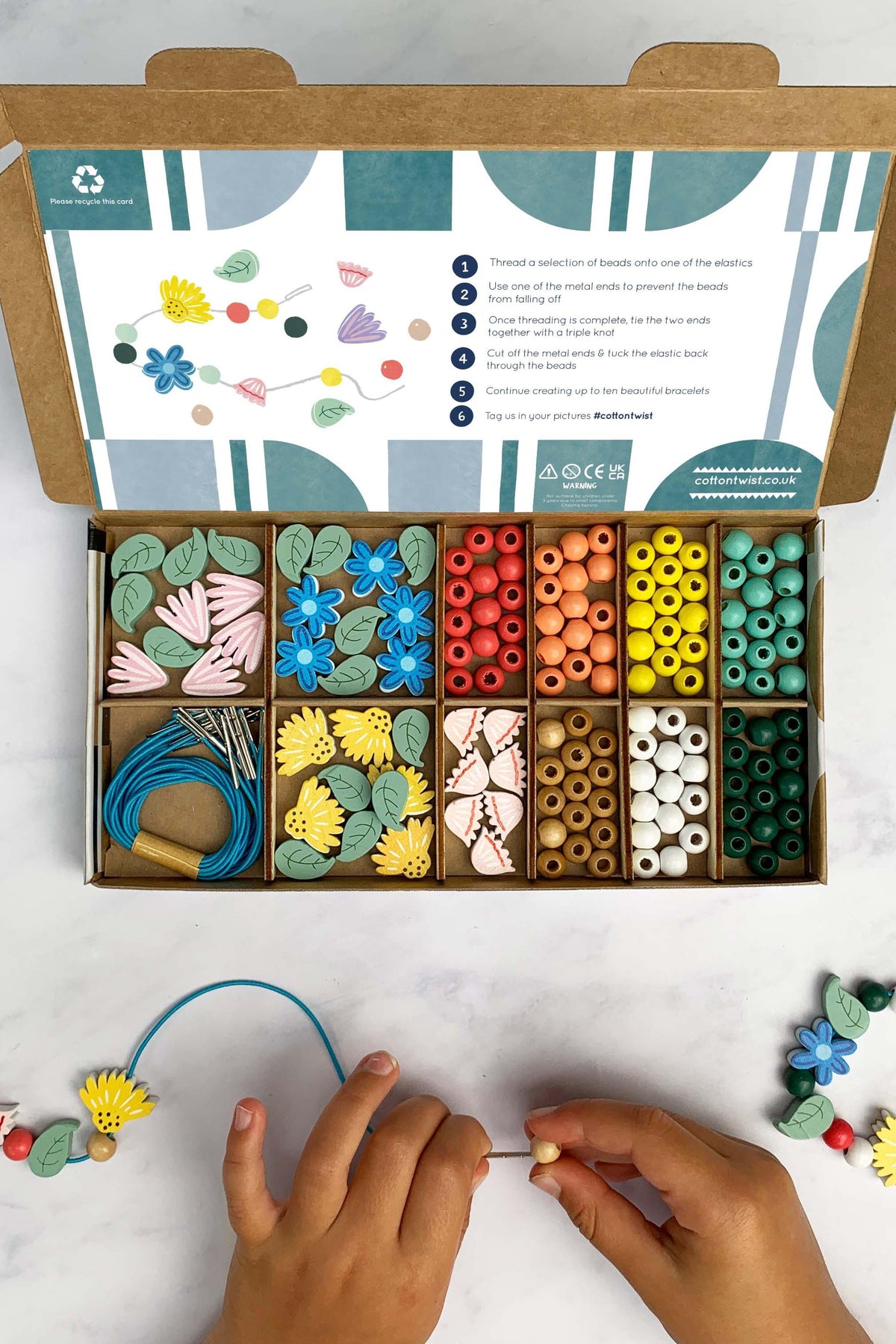 MATERIALS: Box, wooden flower beads, spherical wooden beads, 10 elastics with metal ends for easy threading, instruction card. UKCA/UKNI/CE tested