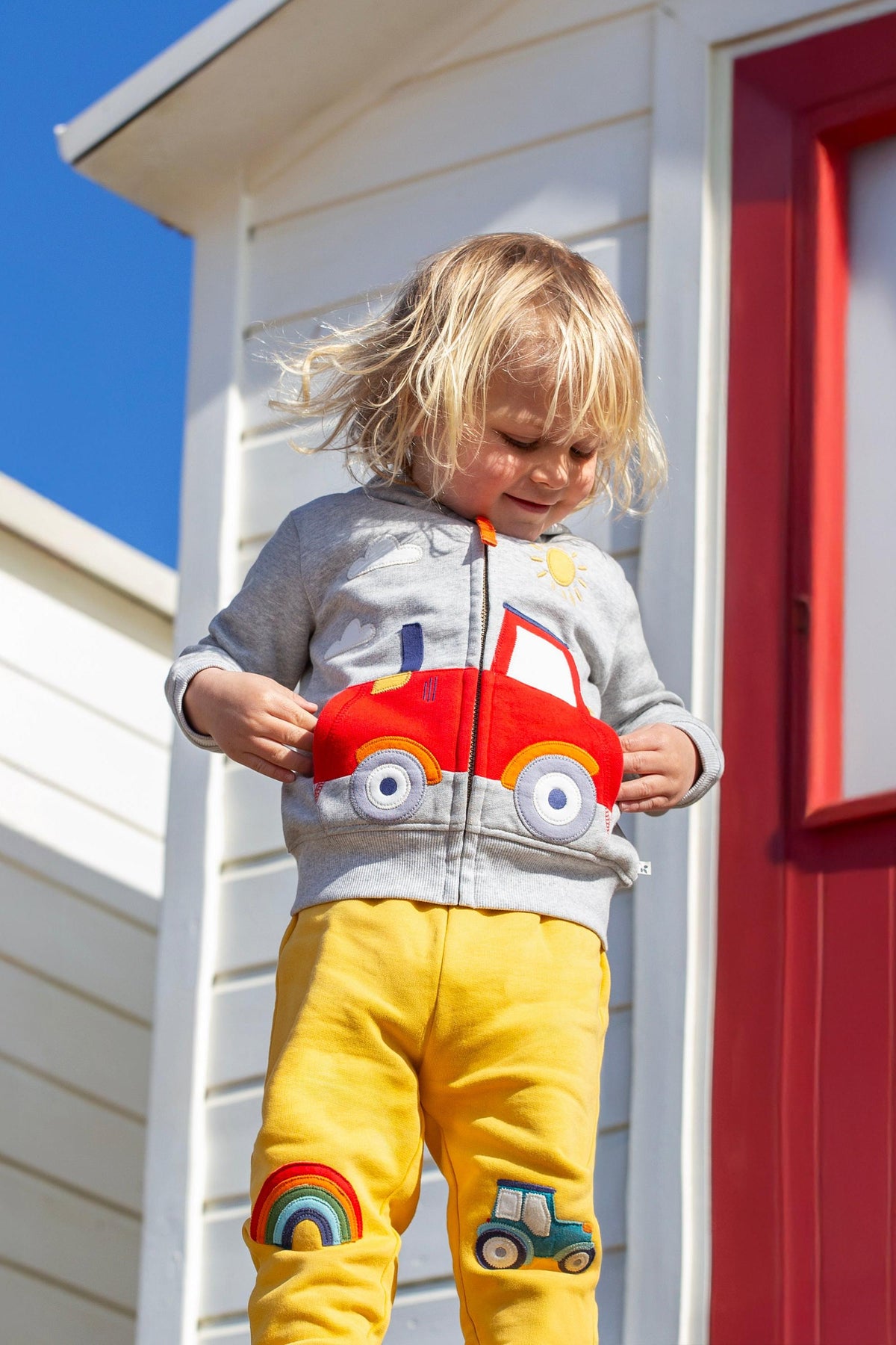 This kids’ zip-up hoodie features bright, colourful appliqué details on the front, adding a fun Frugi touch they’ll love. The snuggly lined hood, along with stretchy ribbed cuffs and hem, helps lock in warmth, making it ideal for outdoor play, school runs and everyday wear.