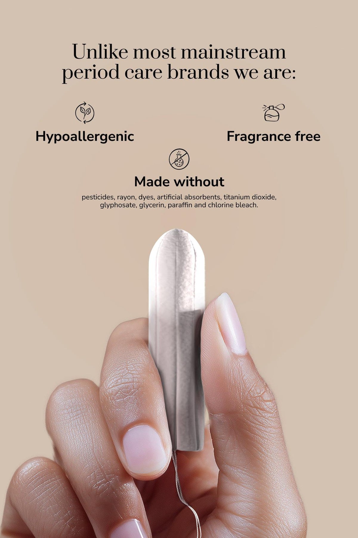 Organic cotton tampon being held by a hand with text about hypoallergenic and fragrance-free properties on a beige background