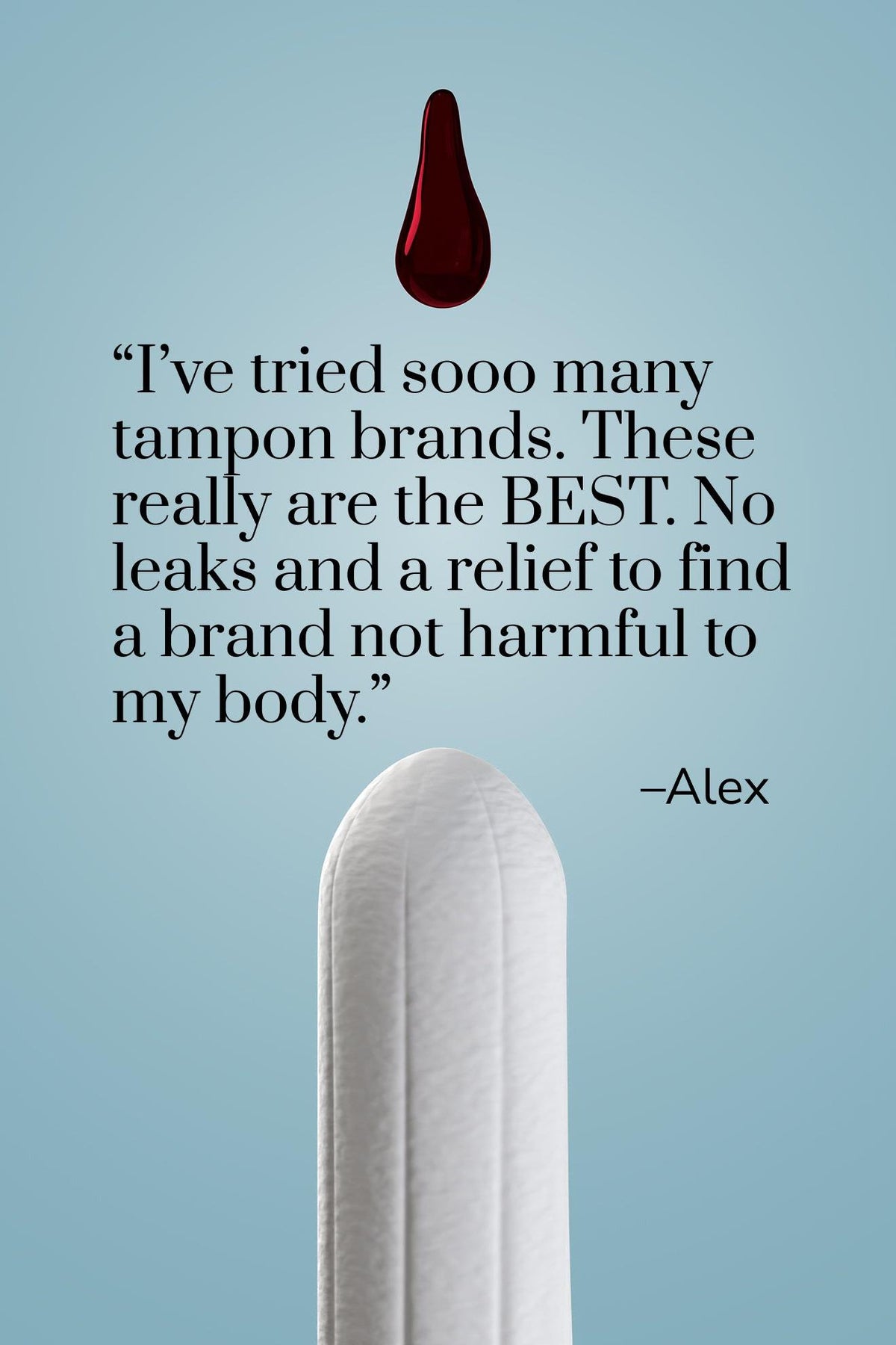 Riley organic cotton tampon with a red blood drop and text on a light blue background