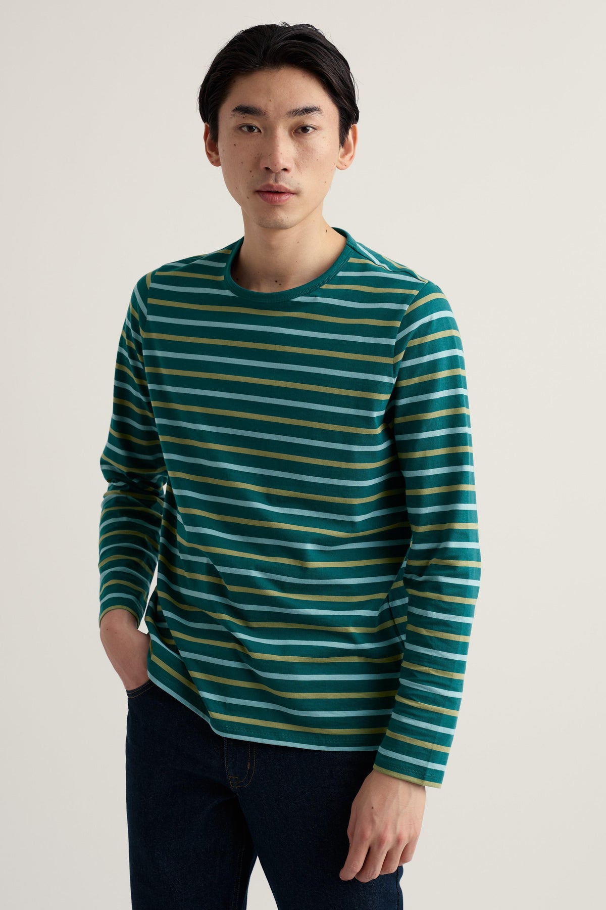 A classic crew neck long-sleeve tee featuring yarn-dyed stripes, inspired by traditional Breton styles and shades taken from Cornwall’s maritime heritage for a timeless nautical look. Made from breathable organic cotton jersey, it’s an easy, throw-on essential you’ll wear all year round.