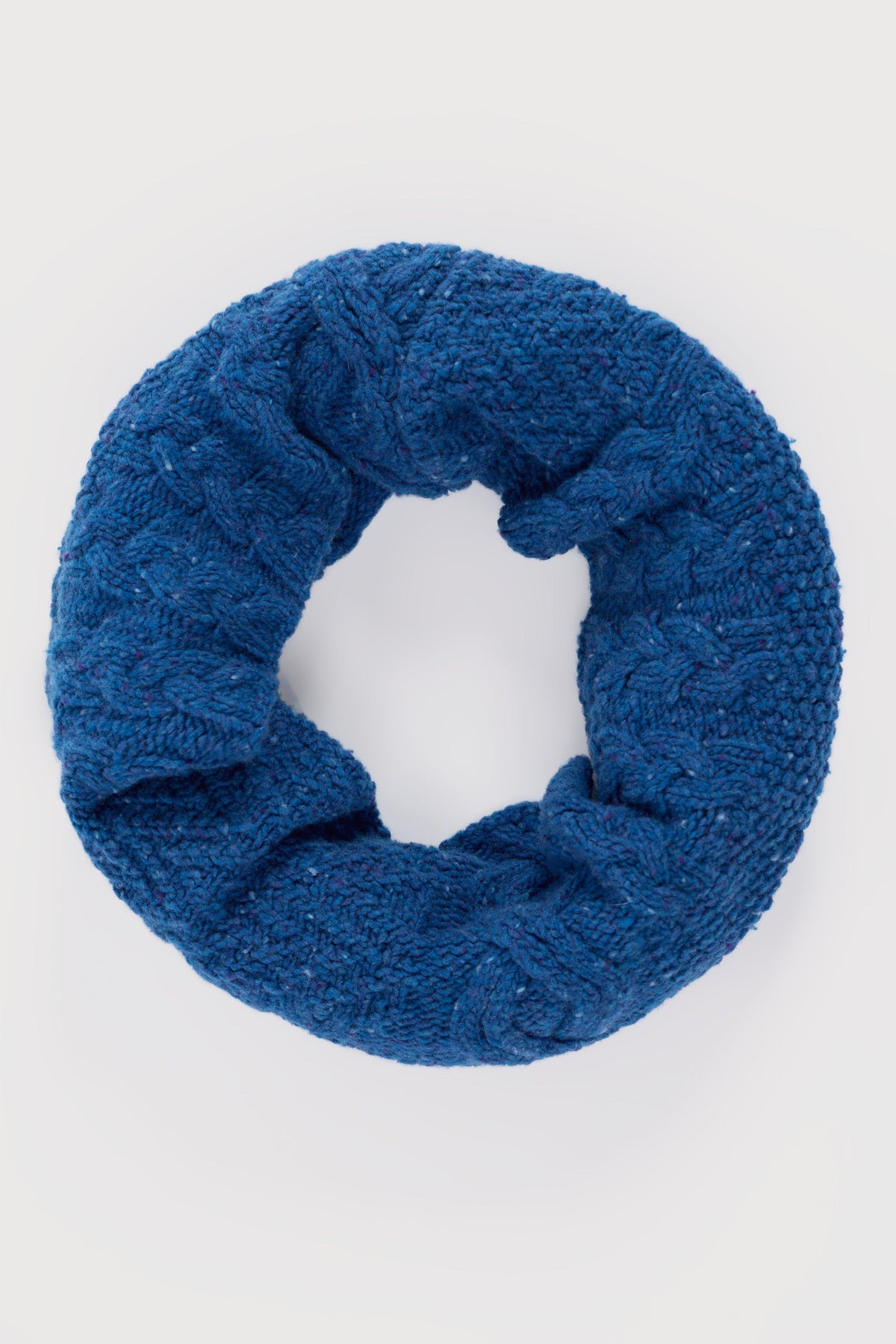 An Aran-style snood featuring a mix of textured stitches, crafted from a flecked yarn that blends responsibly sourced merino, recycled nylon, and soft yak wool. A cosy classic for autumn strolls and winter walks.