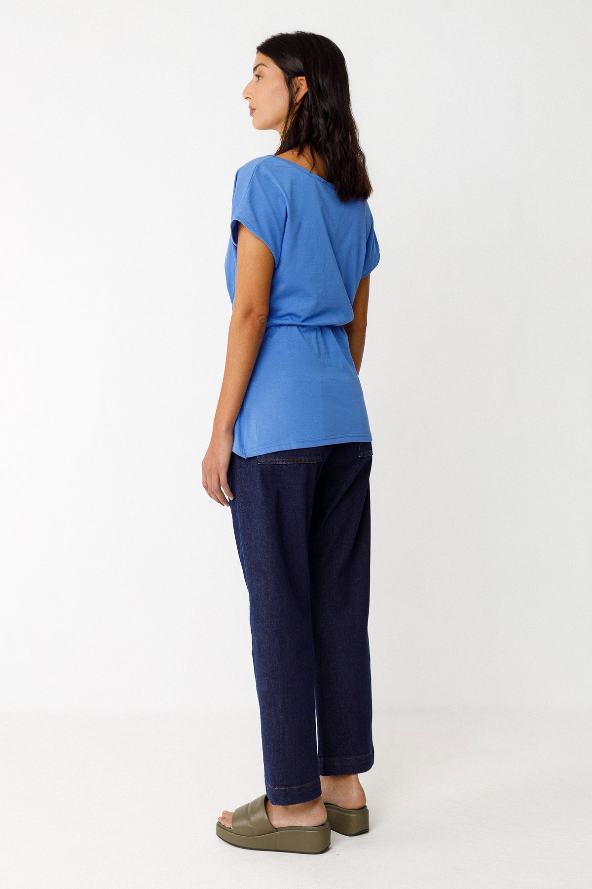 Woman wearing a blue organic cotton top with a knot detail on a white background