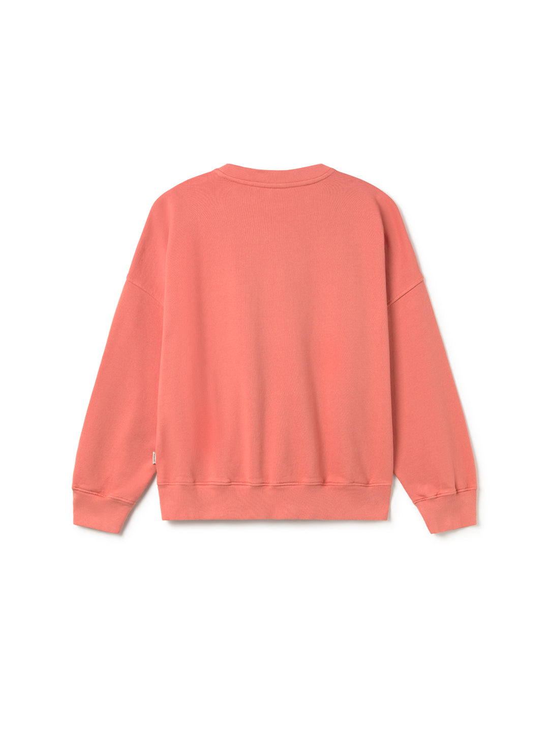 Person wearing a pink organic cotton sweatshirt with a small logo on a plain background