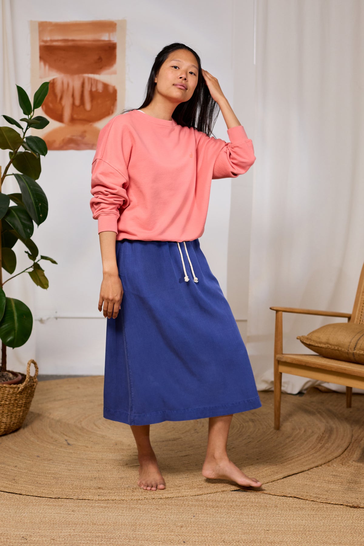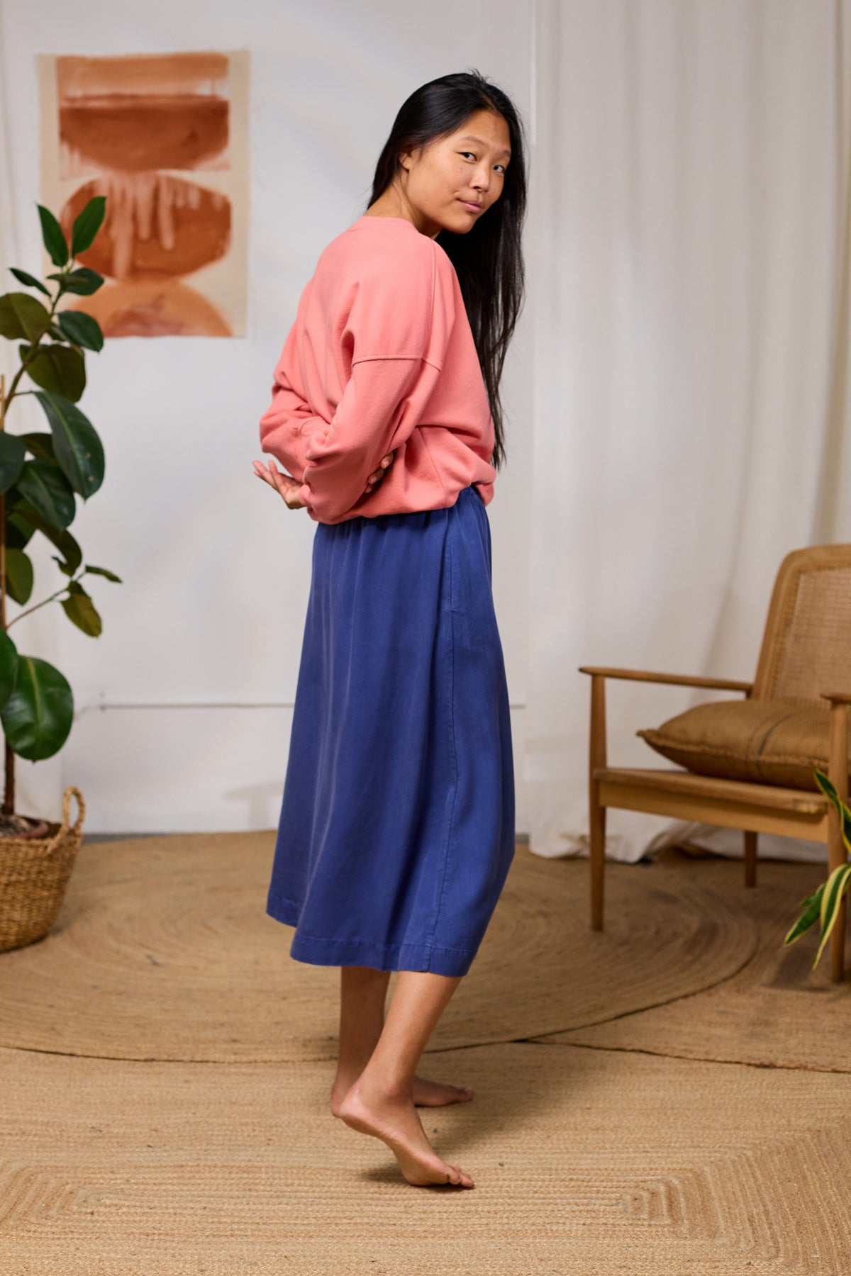 Woman wearing a pink organic TWOTHIRDS sweatshirt and blue skirt standing in a room with a plant and chair.