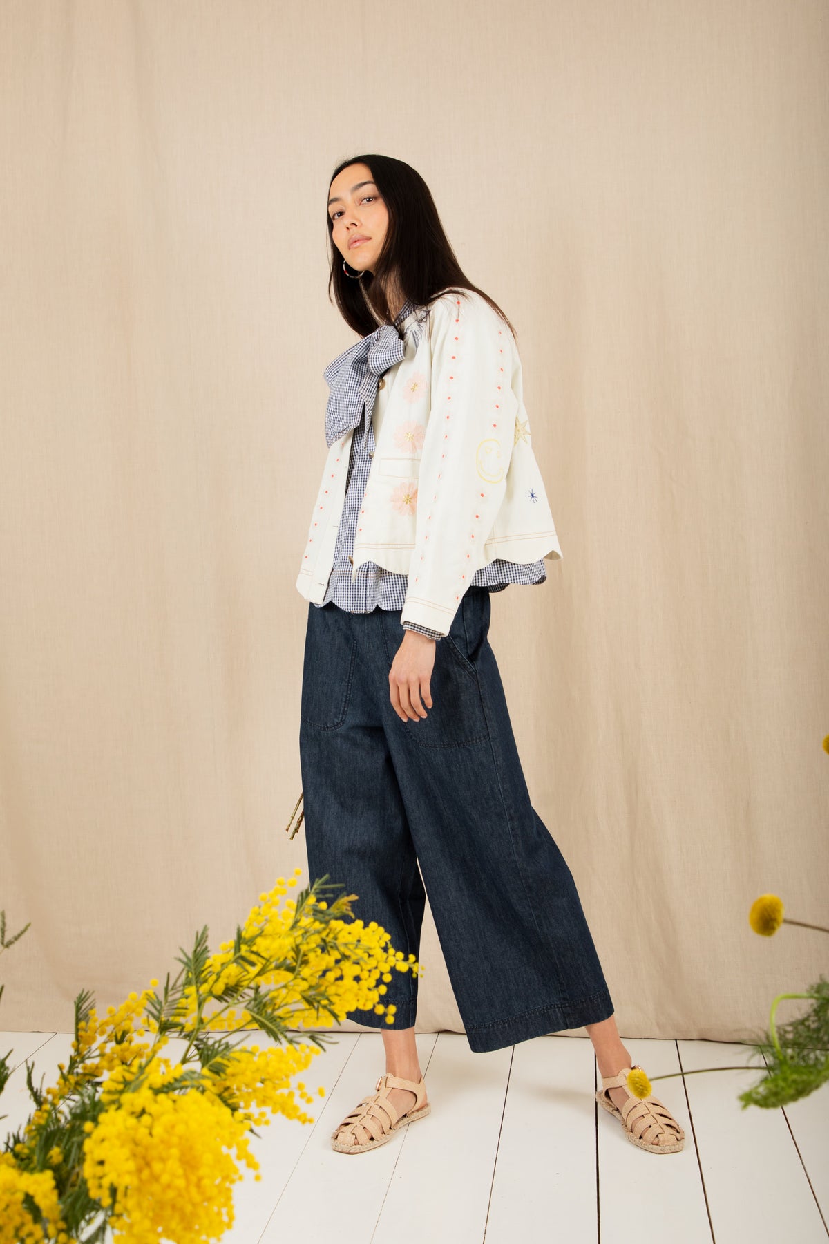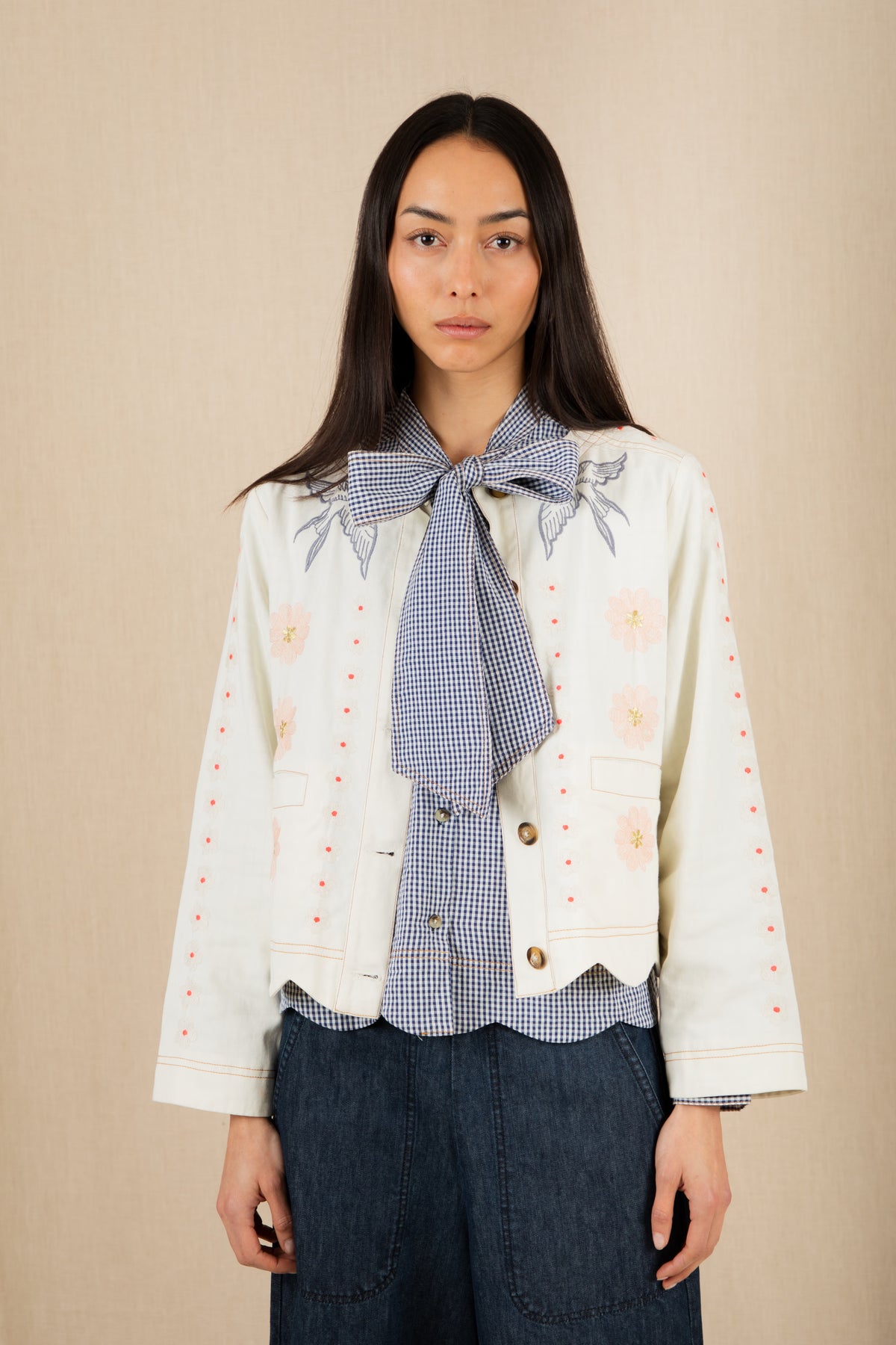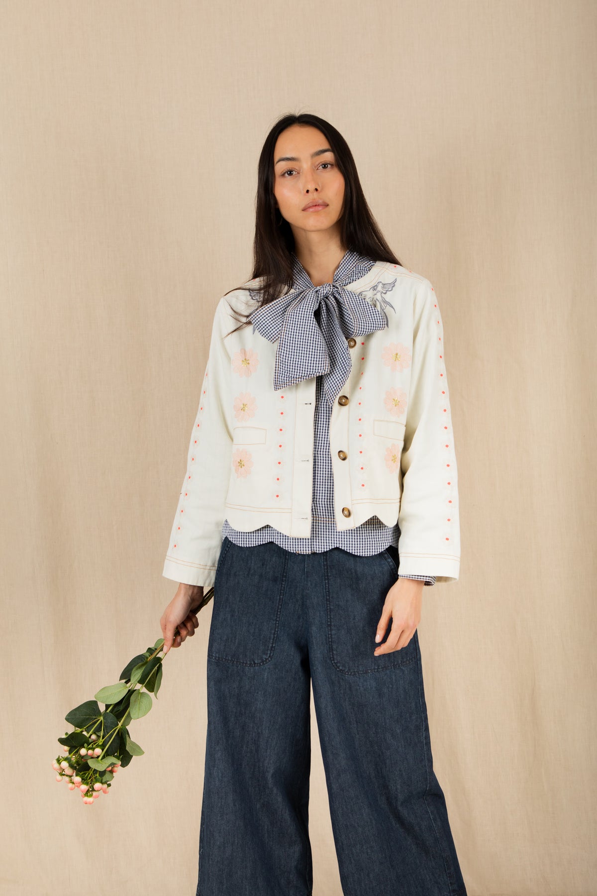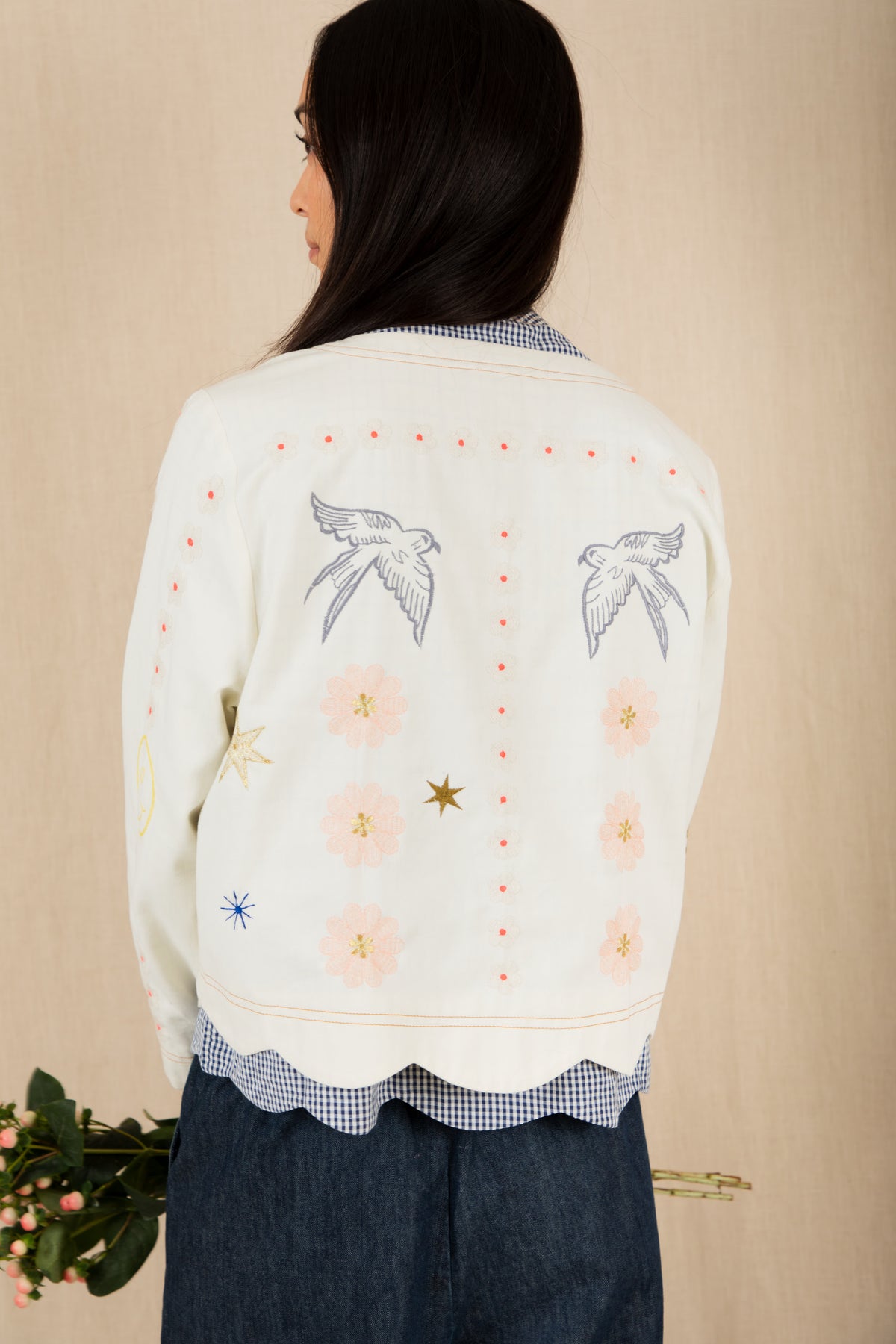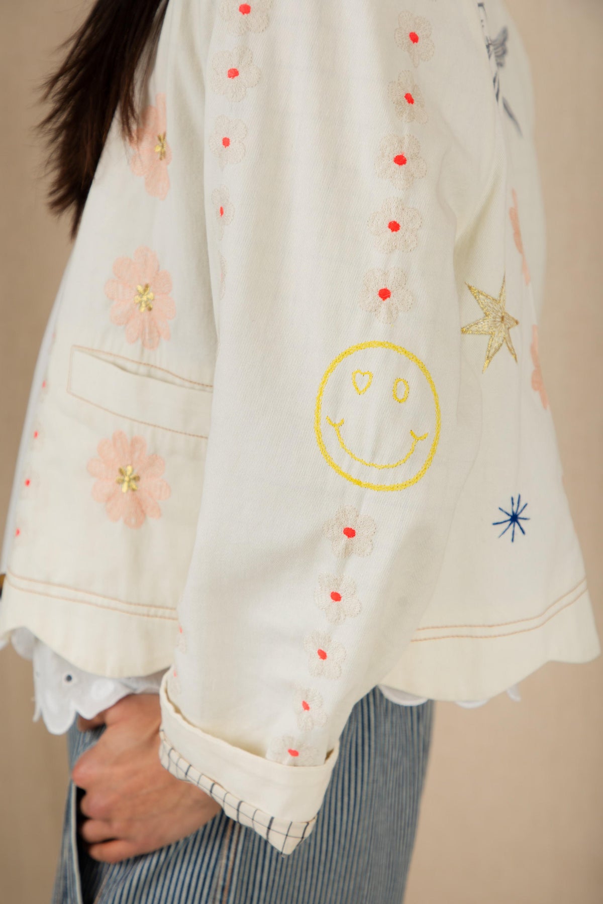 A beautiful, unique jacket from Bonté in soft cotton twill with detailed placement embroidery. Cut in a modern, relaxed boxy shape and finished with contrast tan twin-needle stitching.