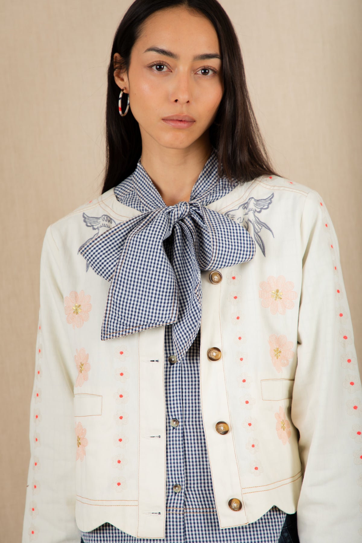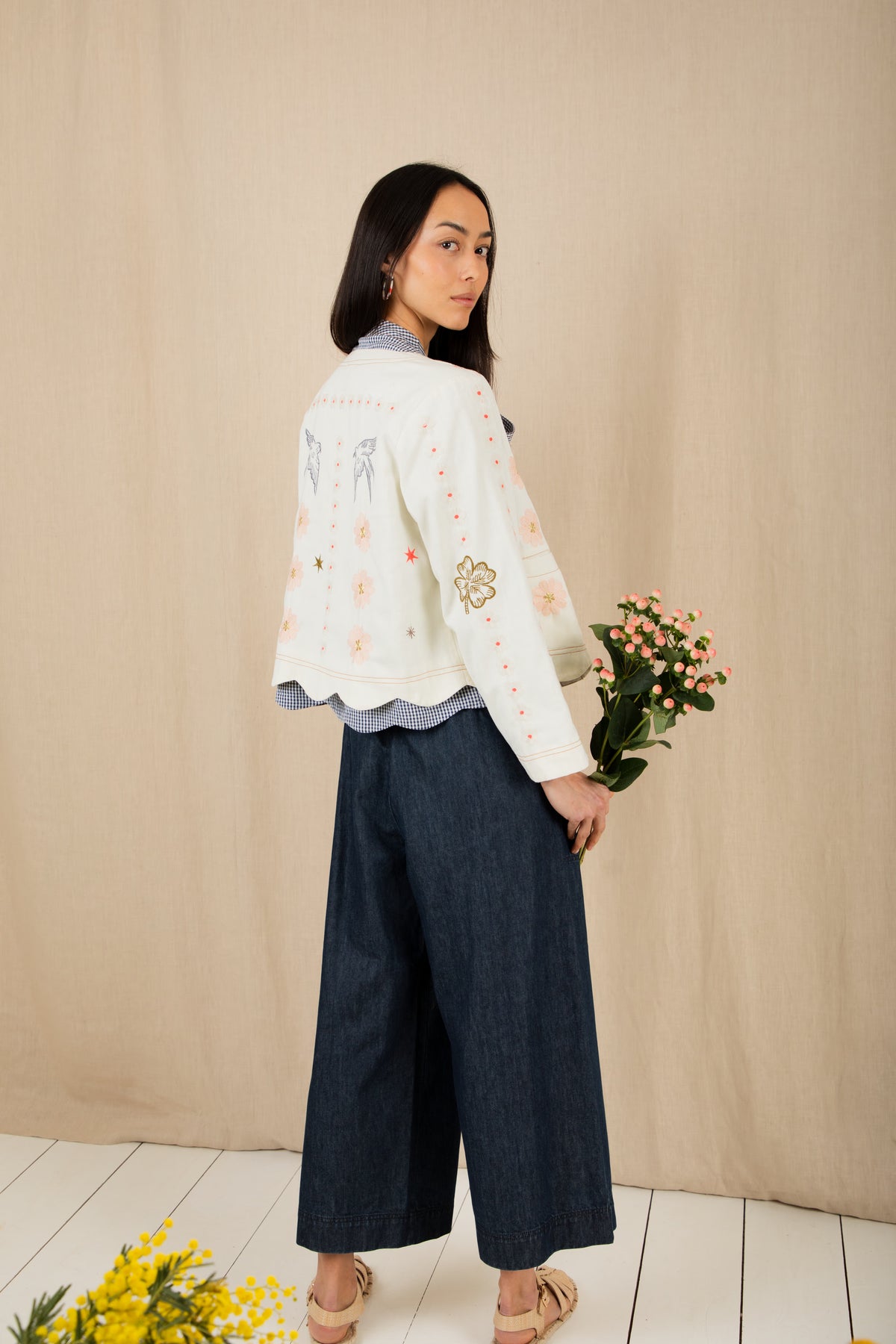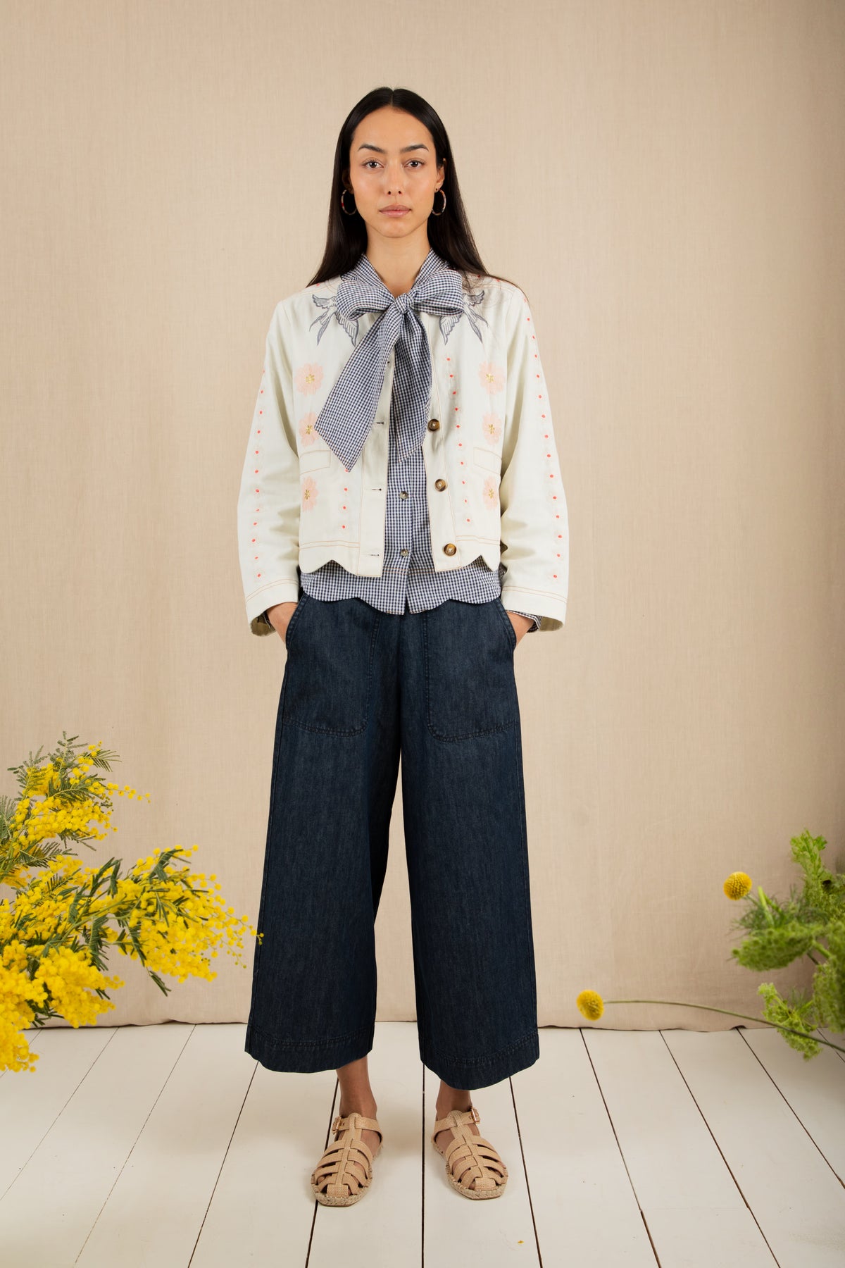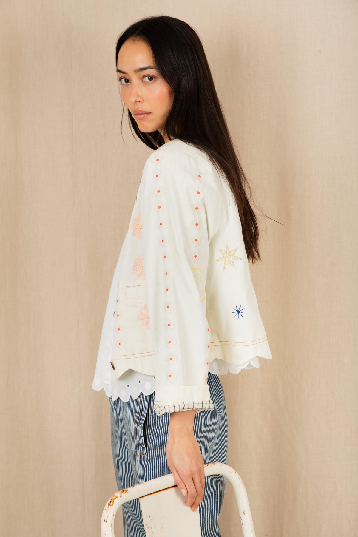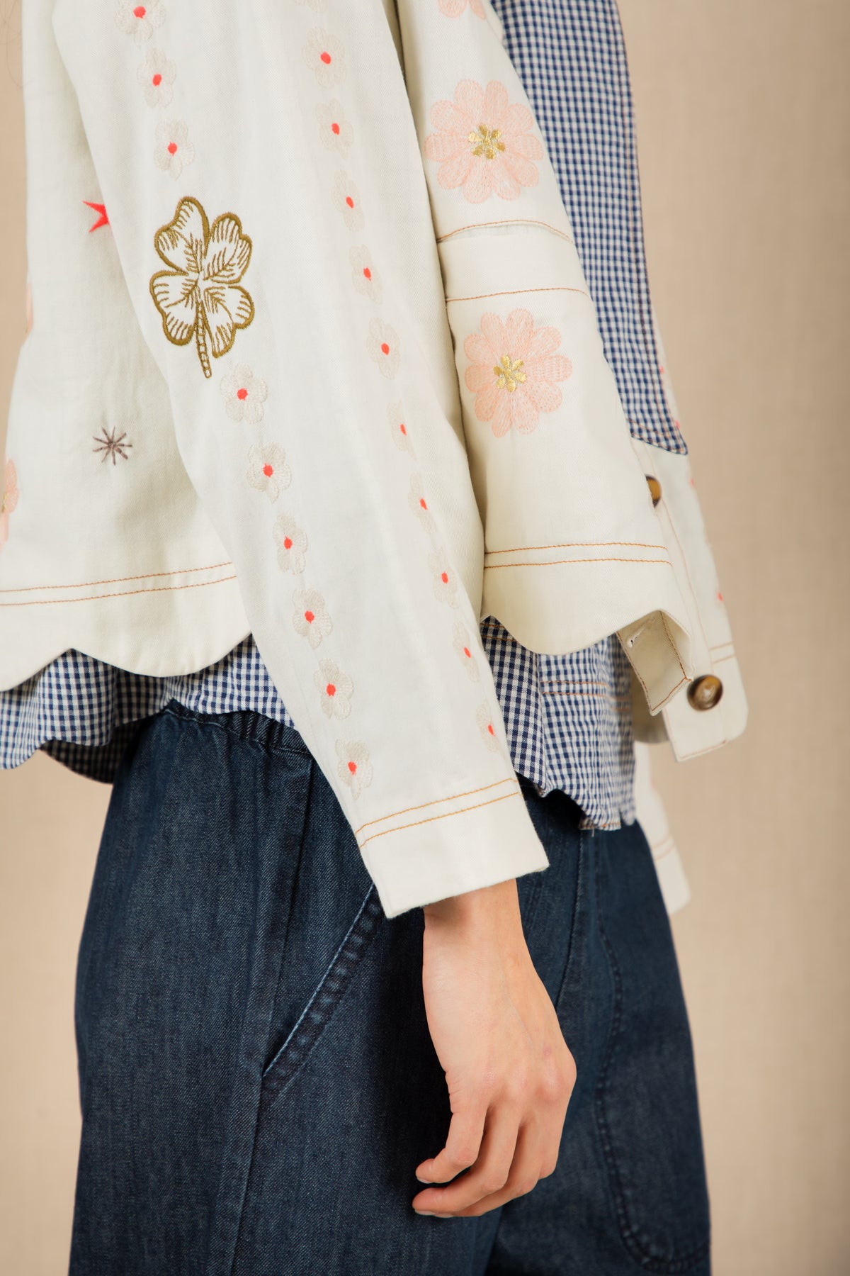 A beautiful, unique jacket from Bonté in soft cotton twill with detailed placement embroidery. Cut in a modern, relaxed boxy shape and finished with contrast tan twin-needle stitching.