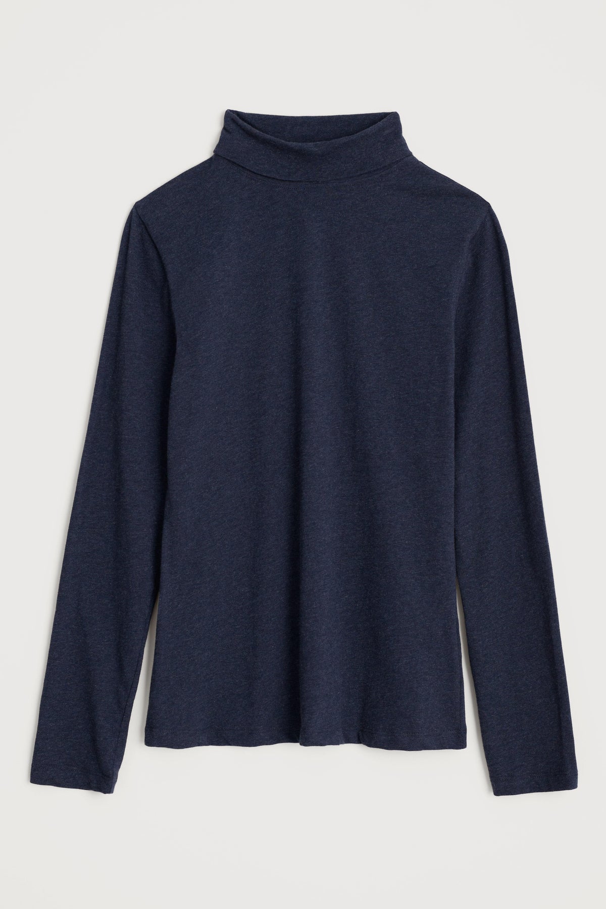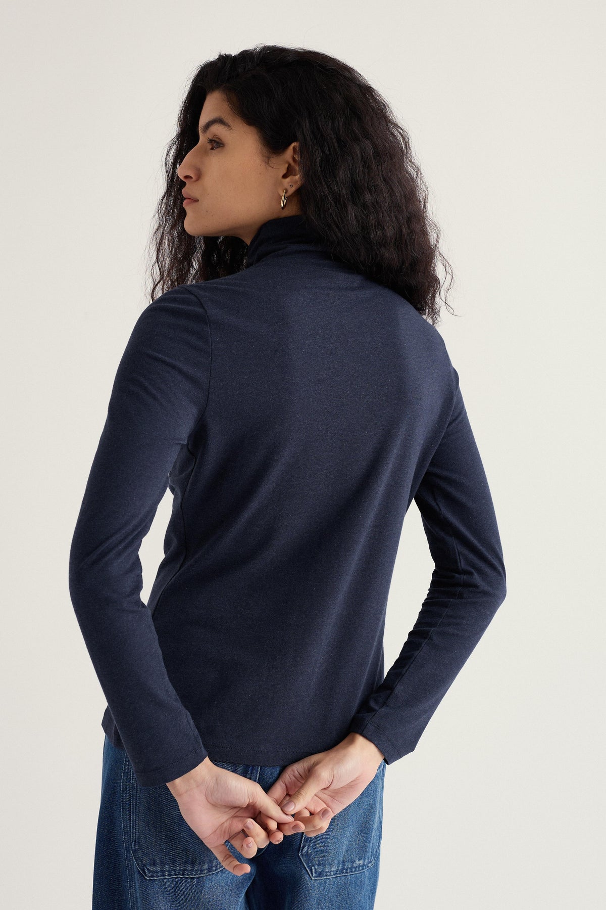 A semi-fitted, long-sleeve top featuring a relaxed roll neck, crafted from organic cotton with a touch of stretch. Our Landing Top pairs beautifully with denim or layered under dungarees and pinafore dresses on cooler days.
