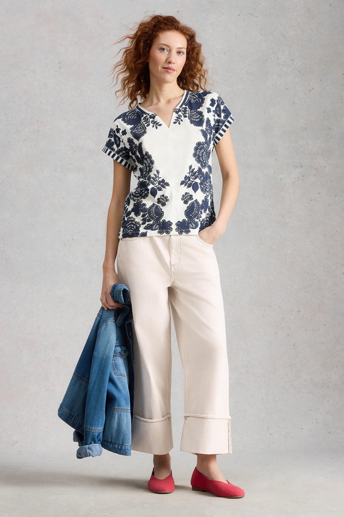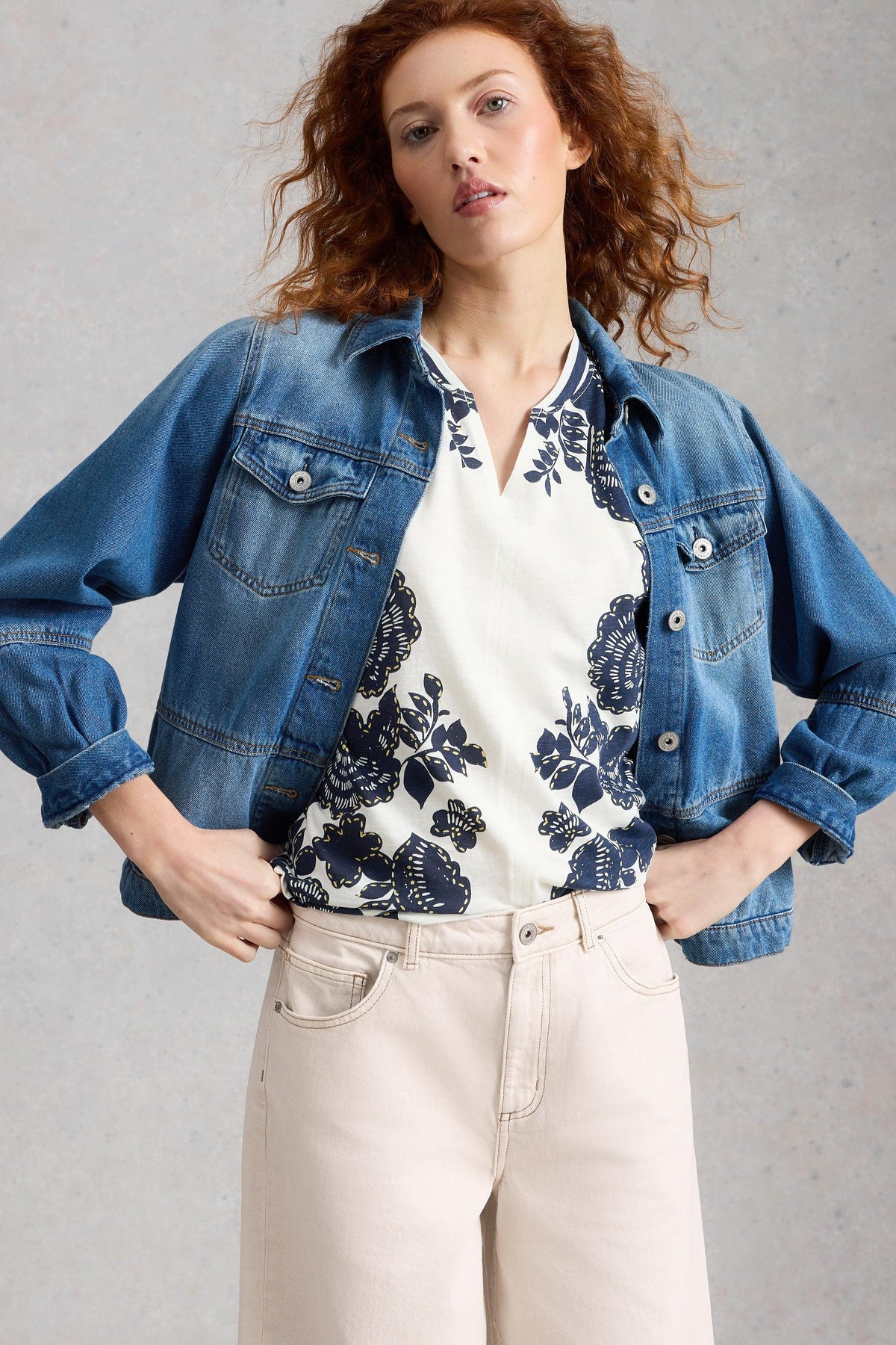 Woman wearing a floral White Stuff blouse and white pants, holding a denim jacket against a gray background