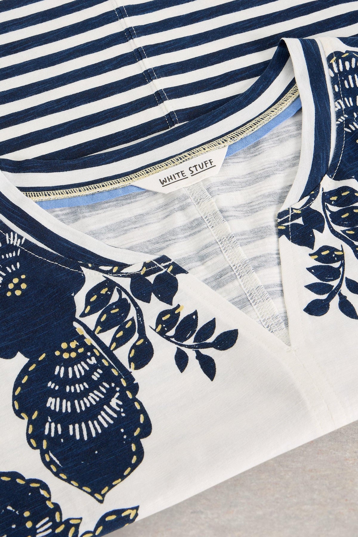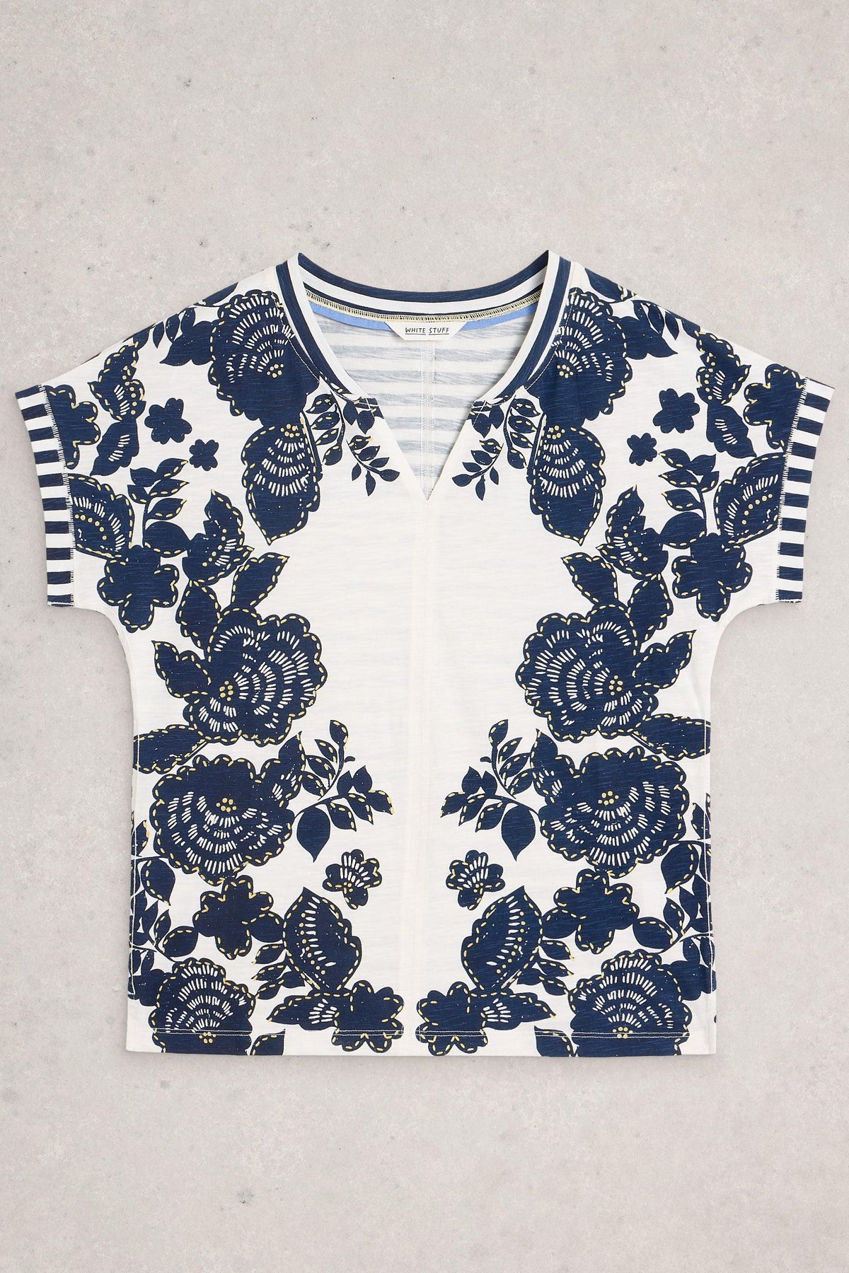 White Stuff t-shirt with blue floral patterns on a gray background