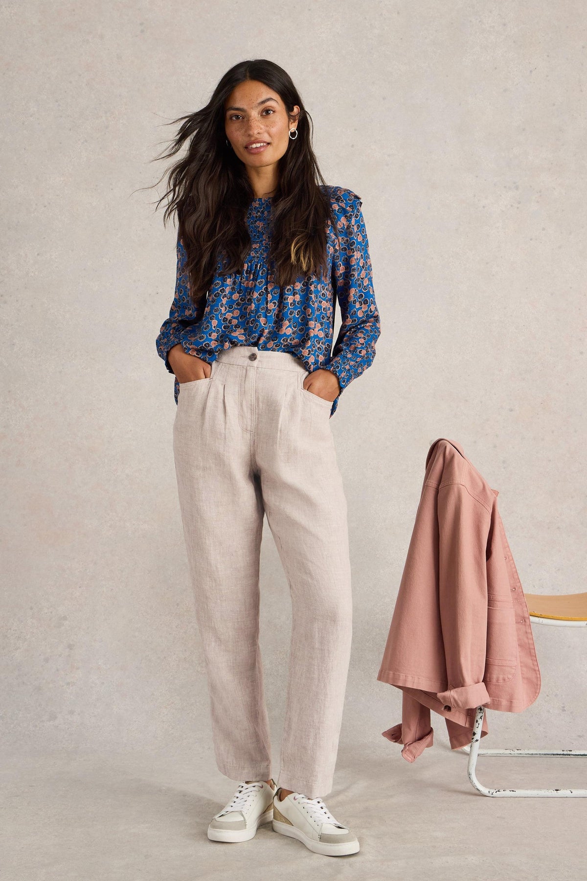 Woman wearing a blue floral blouse and  linen tapered trousers with a pink jacket on a chair in the background.