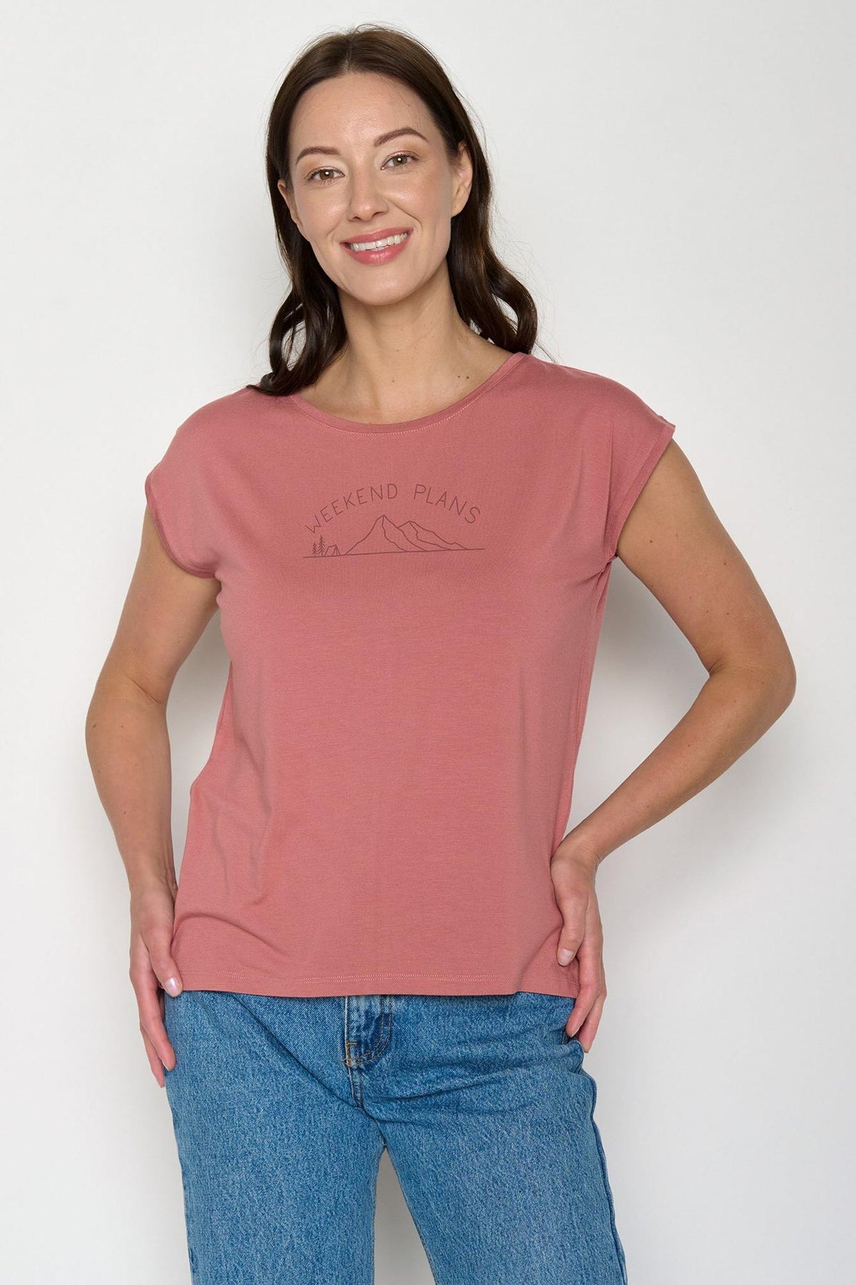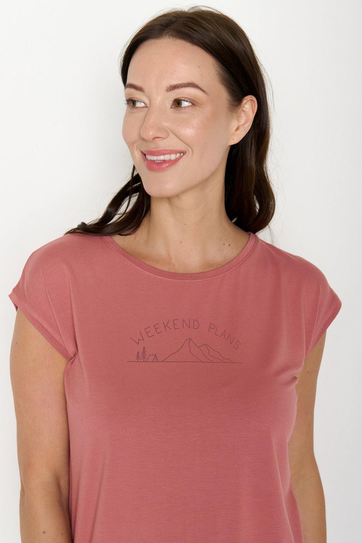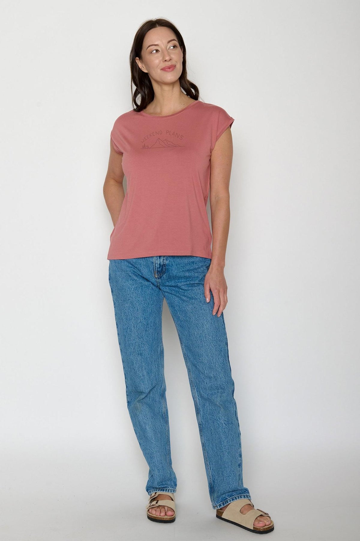 Pink eco-vero t-shirt with a mountain graphic on a white background