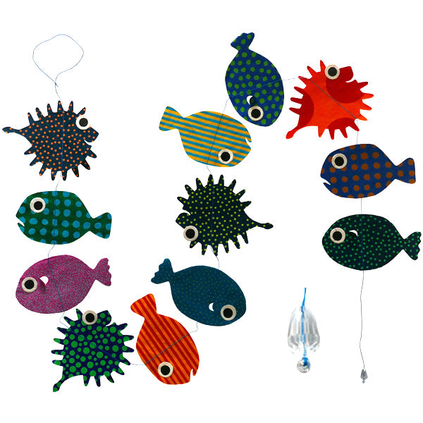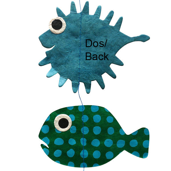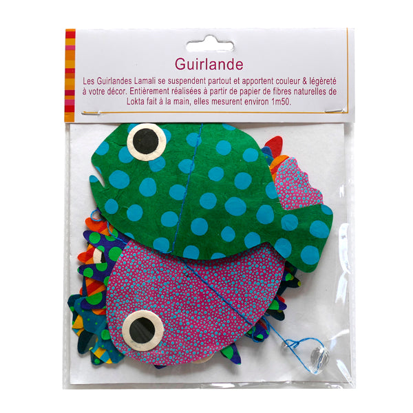 Zanzibar Fish Garland - 1,5m approx. - Printed Lamali Lokta paper forms, stitched as a garland - Handmade in Nepal. These large, colorful fish float placidly in the air, casting their affectionate, kind eyes (front/back) and their very contagious serenity over everything.