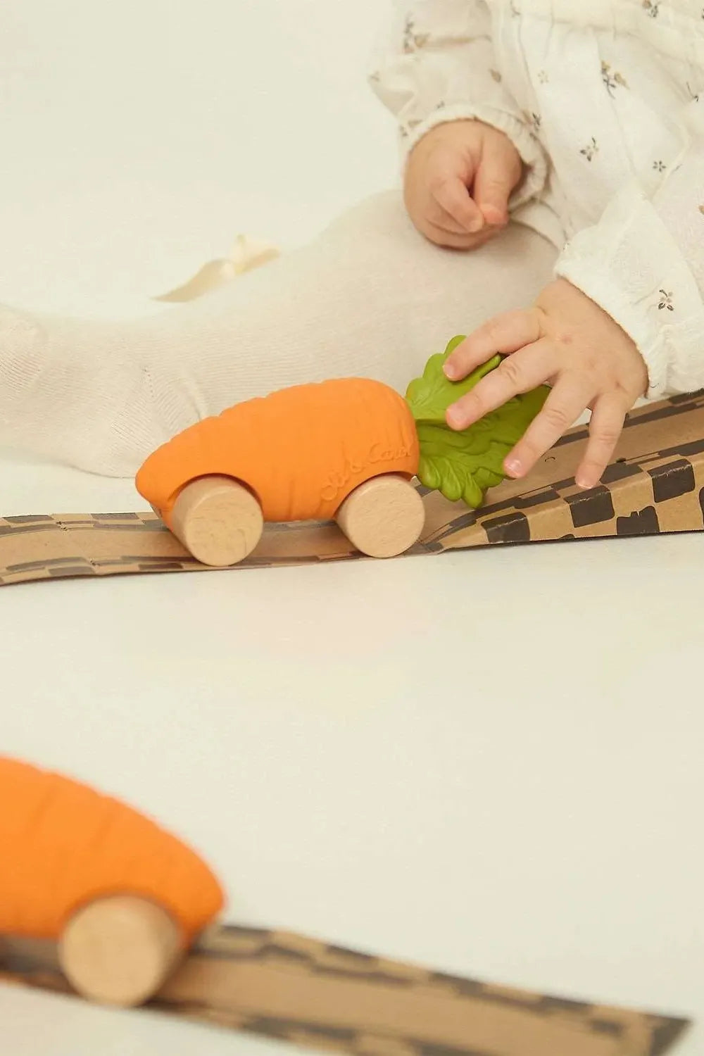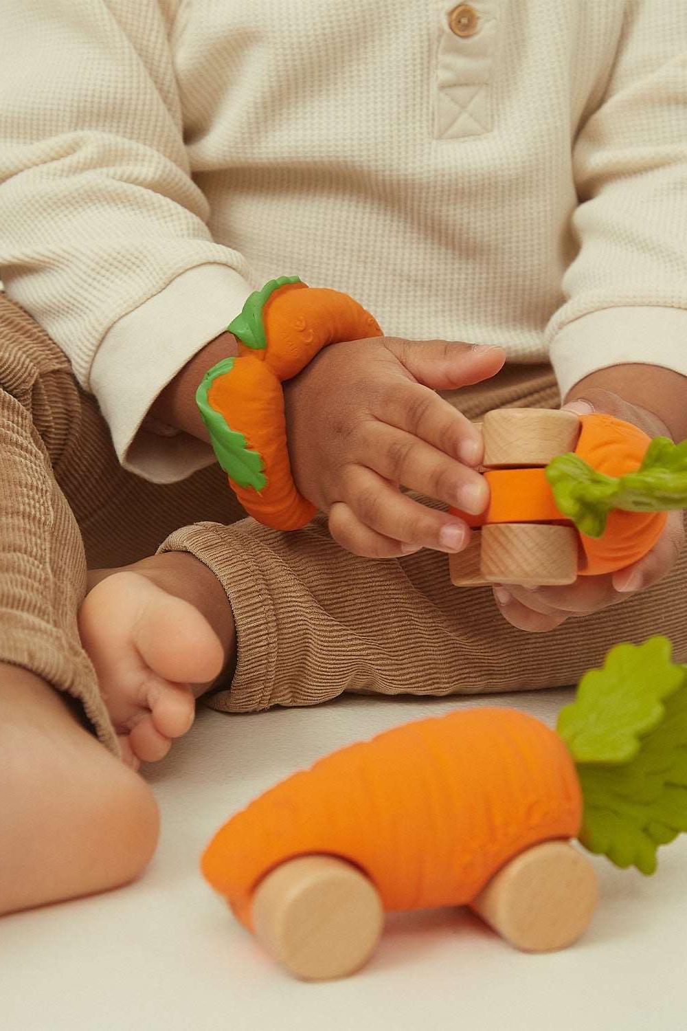 Carrot-inspired infant car toy, FSC-certified wood and natural rubber, eco-conscious and perfect for imaginative play.