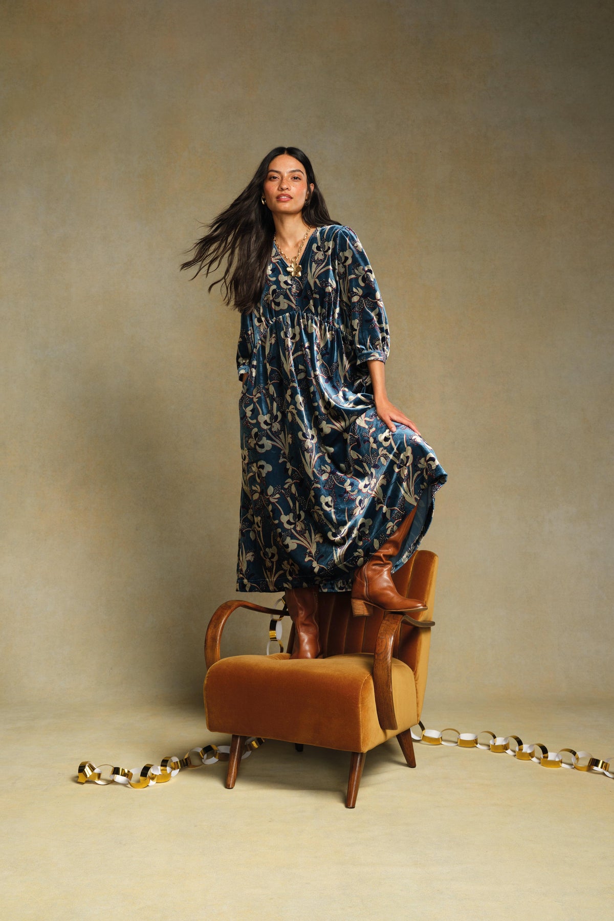 A luxe velvet midi dress with a relaxed fit, 3/4 sleeves, and a flattering V-neck. Available in striking jewel tones.