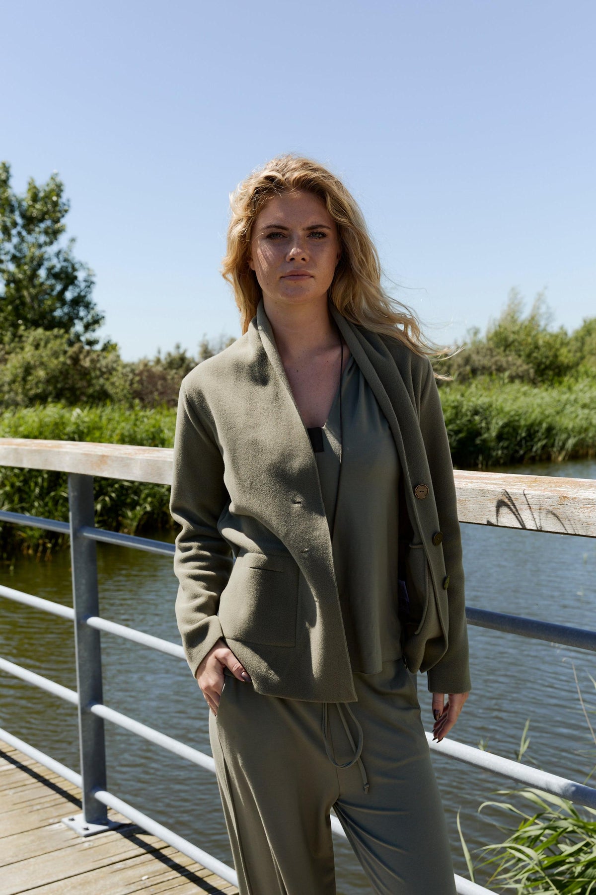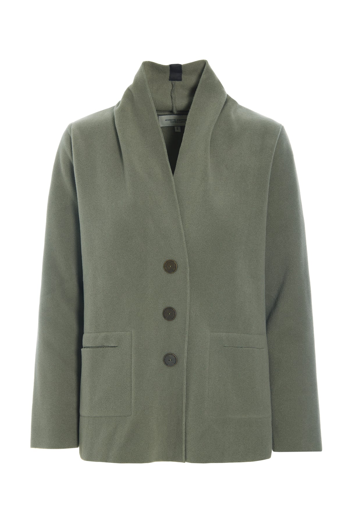 Short cardigan in a soft dusty green with a shawl collar, pockets, and button placket.