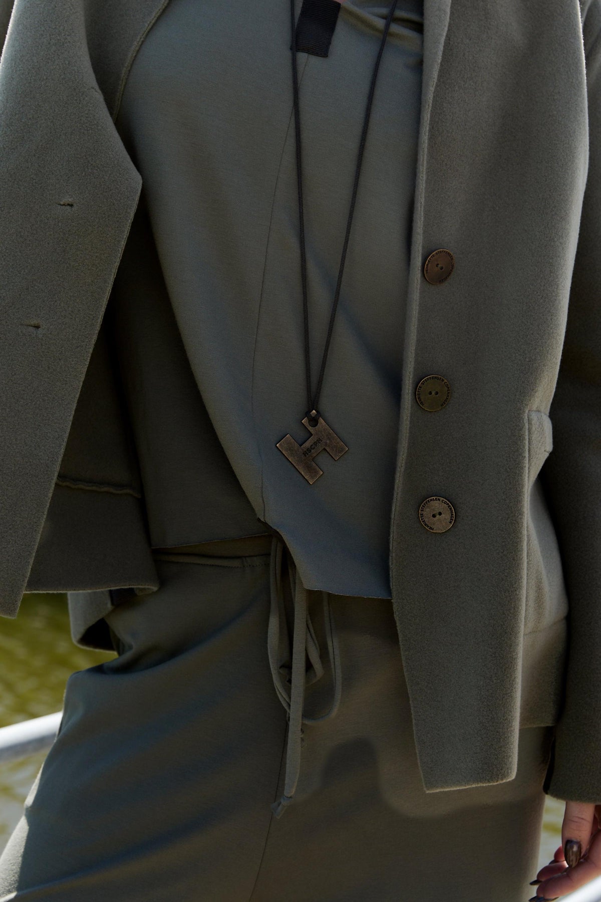 Close-up of a person wearing a Henriette Steffensen outfit with a necklace.