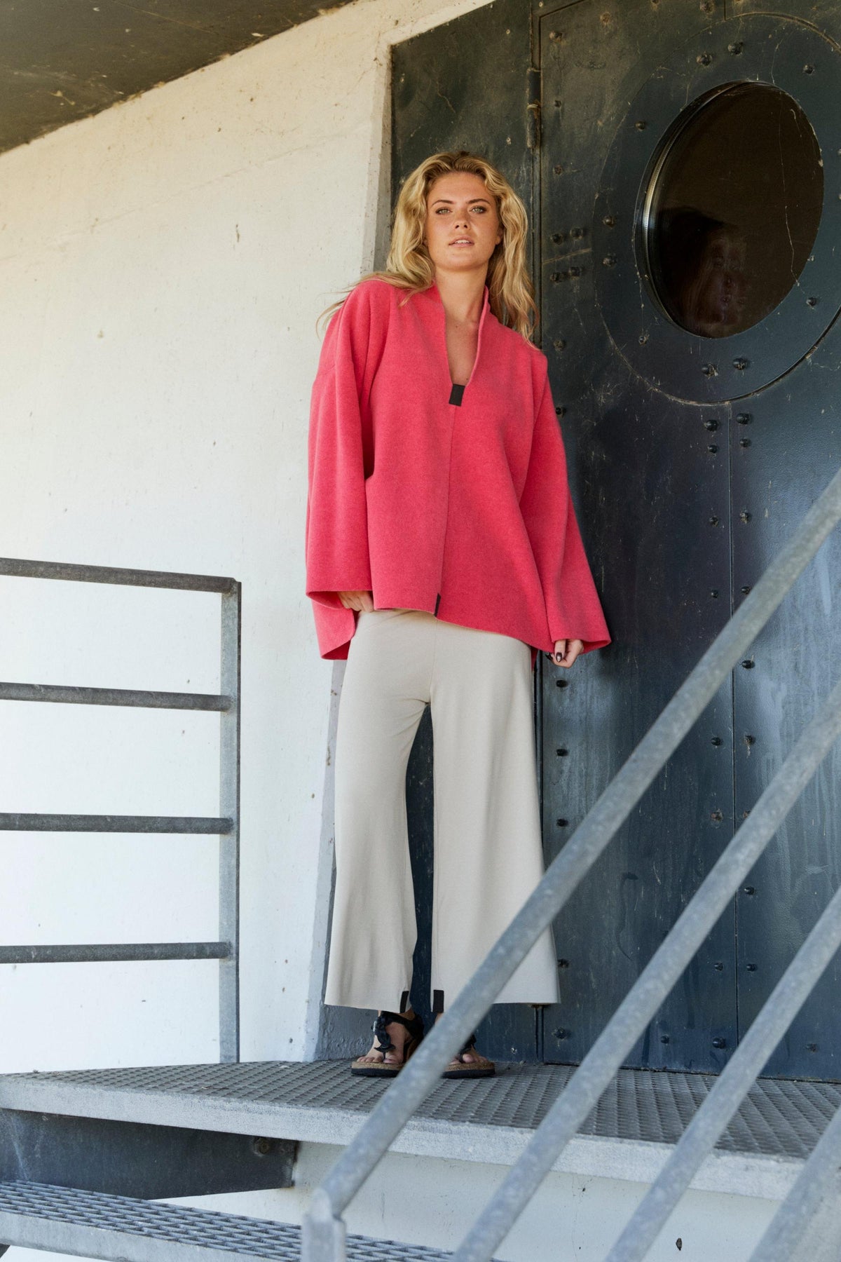 Woman in a pink Henriette Steffensen fleece and white pants standing in front of a large metal door.