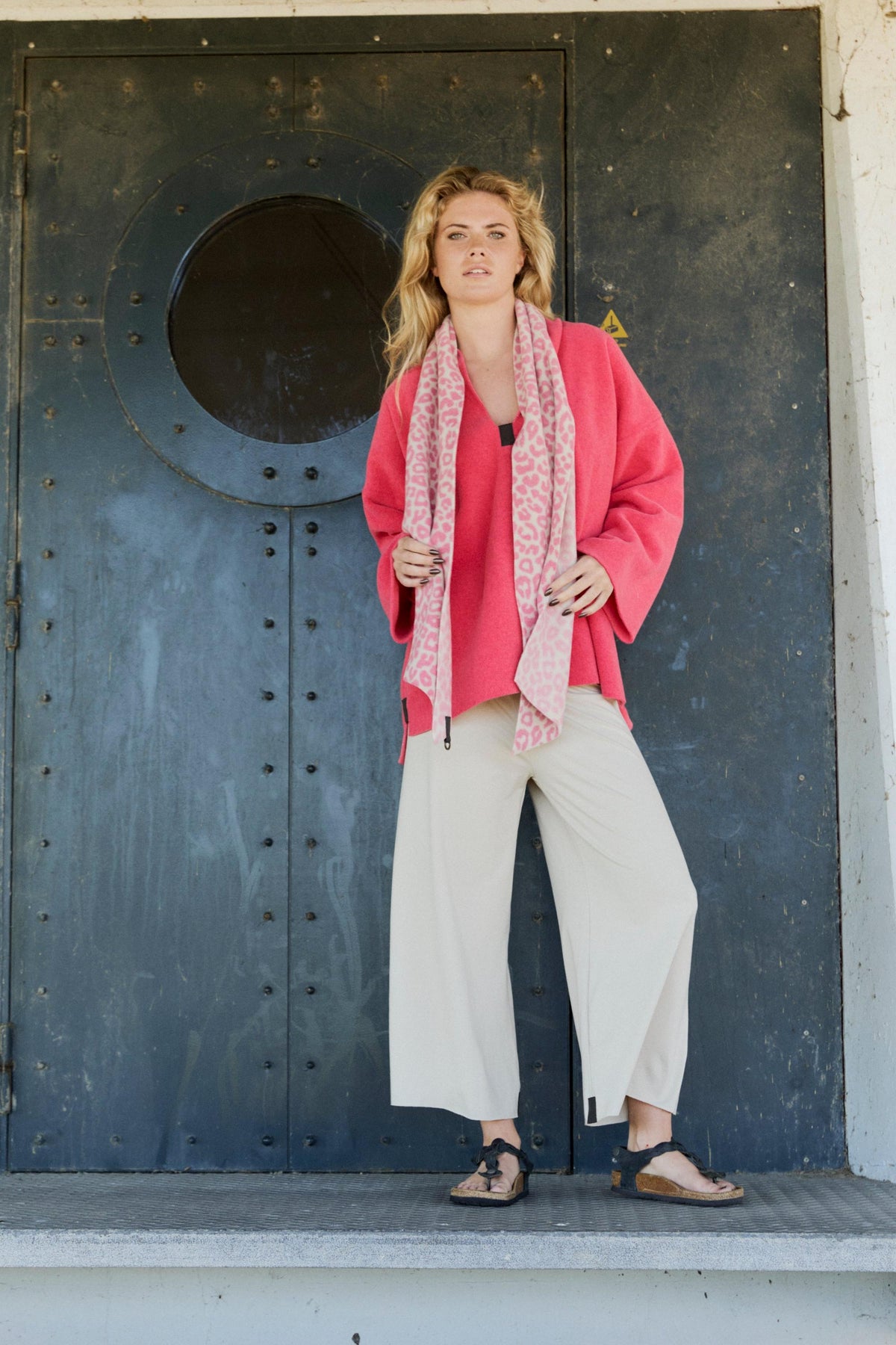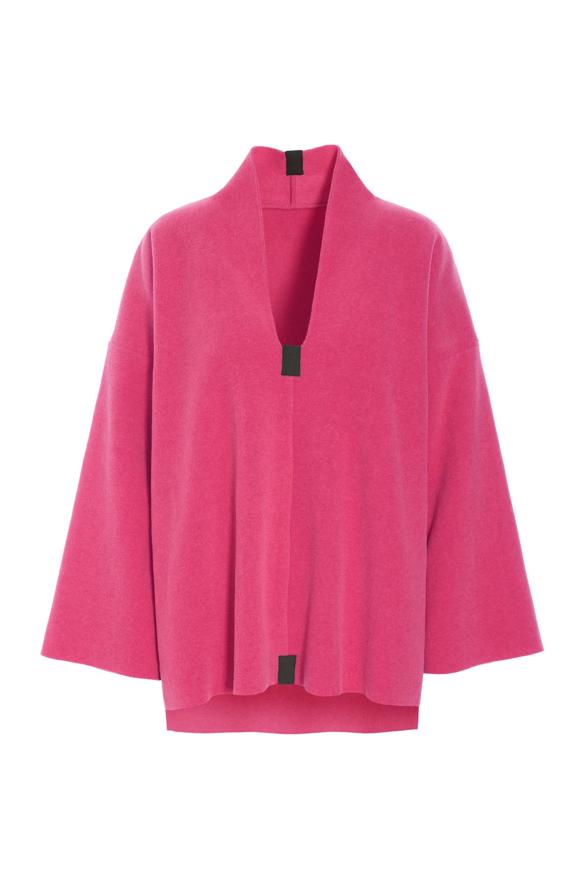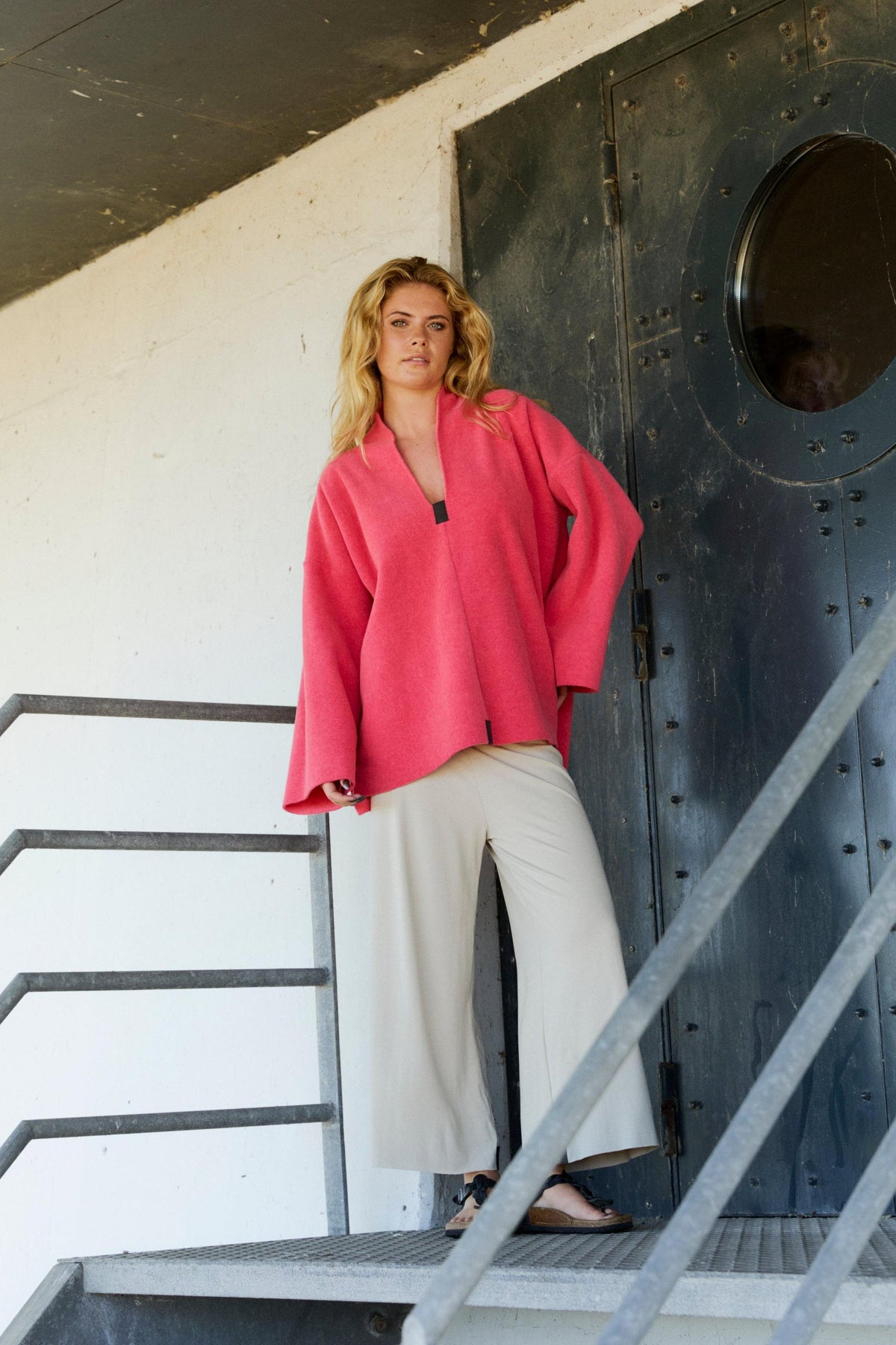 Casual fleece pullover in a warm sunset pink with a shawl collar and relaxed, roomy silhouette. Side slits and a slightly longer back let you wear it comfortably on its own, no top needed underneath.