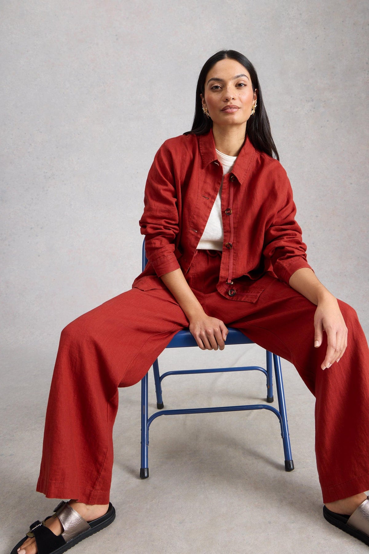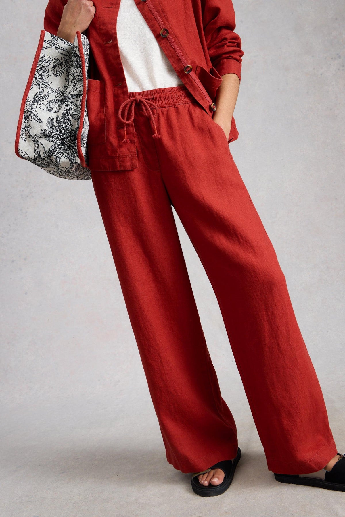 Person wearing a red outfit with wide-leg linen pants and a matching linen jacket, holding a patterned bag.