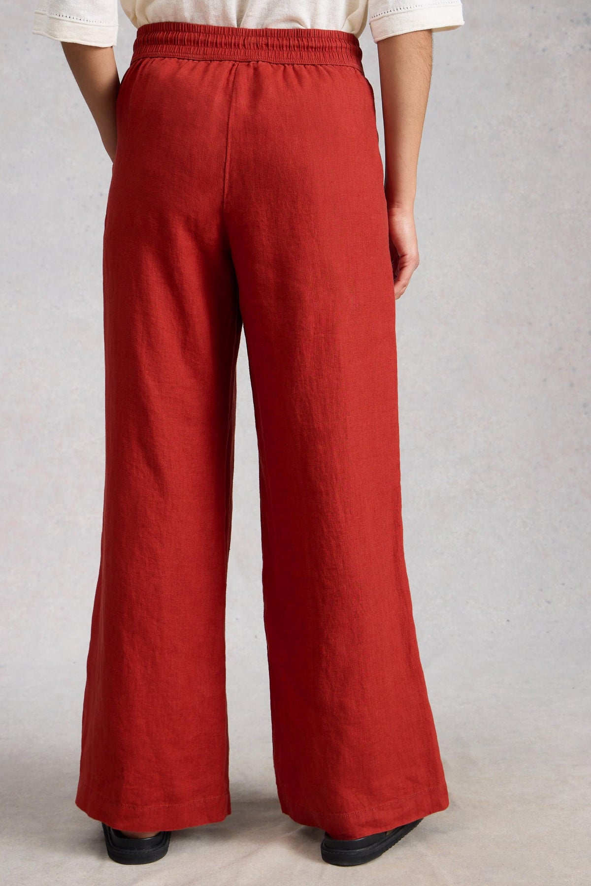 Red wide-leg linen pants worn by a person on a plain background