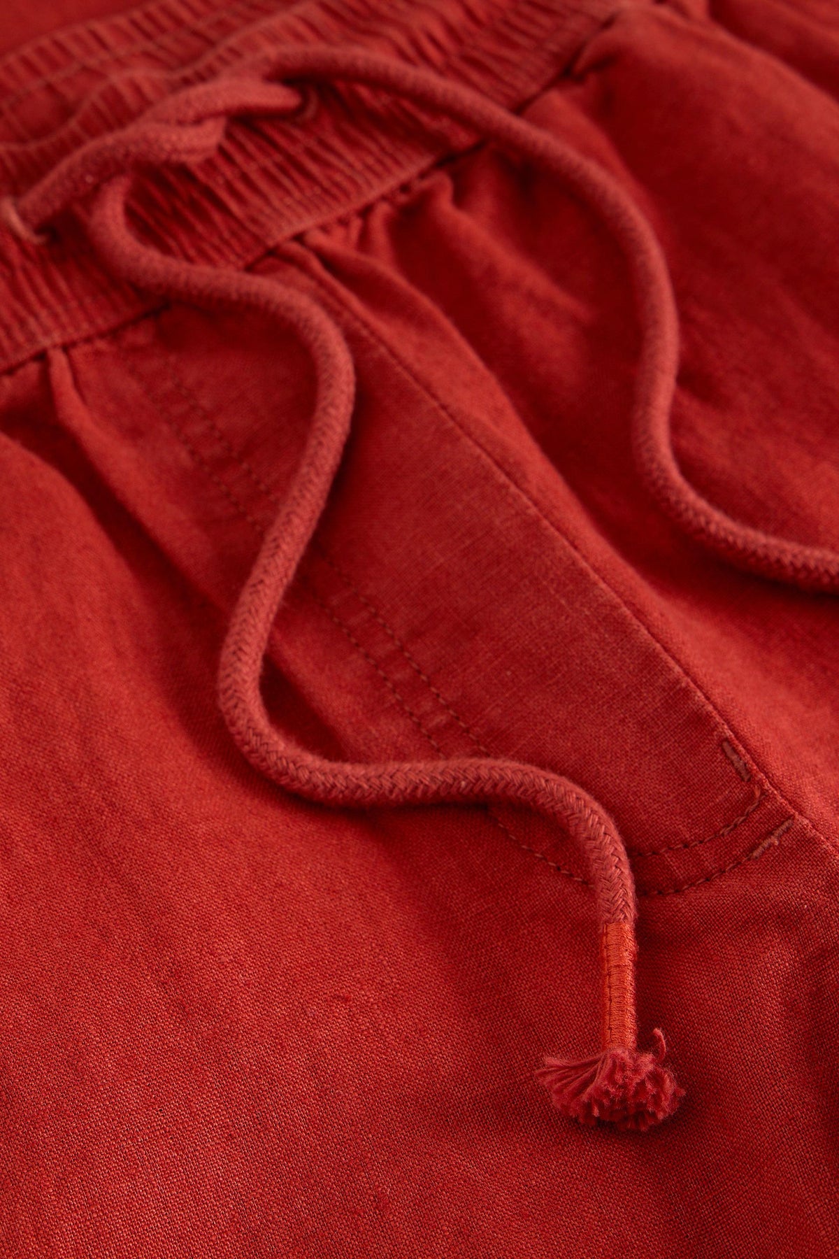 Red linen pants with a drawstring waist on a light gray background