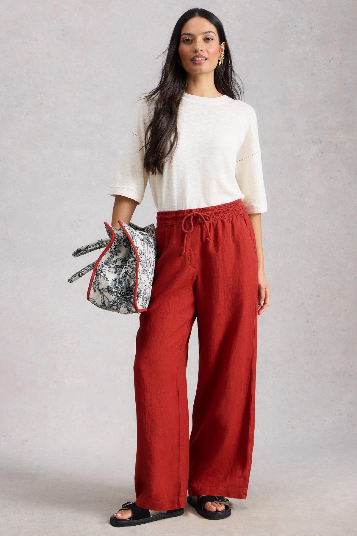 Woman wearing a white top and red wide leg linen pants holding a patterned bag against a gray background
