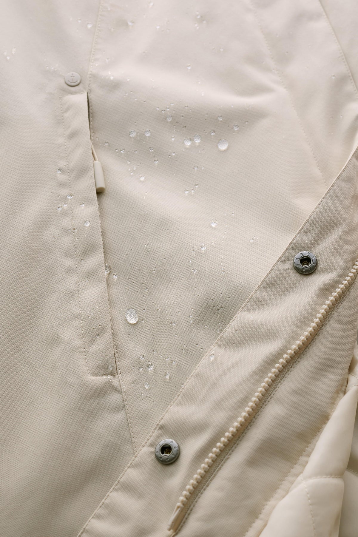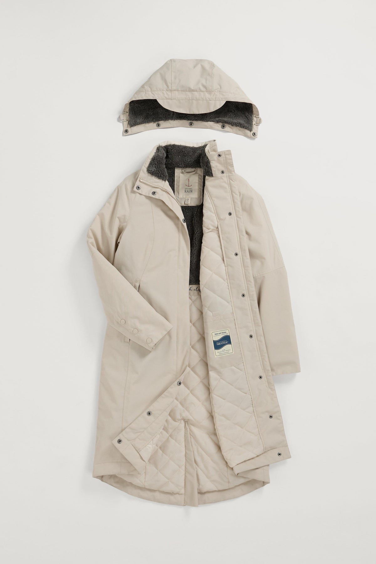 Lleno de características técnicas y hecho para durar, Janelle es un impermeable hasta la rodilla confeccionado con un exterior Tide Cycle® de nailon reciclado. Está diseñado para resistir las peores condiciones climáticas, con espacio para capas debajo. La mitad superior está forrada con un acogedor tejido polar del mismo tono, mientras que la mitad inferior está acolchada para brindar calidez y facilidad de movimiento. La capucha desmontable tiene un pico para proteger tu rostro del viento y la lluvia, y hay tiras reflectantes en la parte posterior de la capucha y la parte inferior de las mangas para hacerte más visible después del anochecer.