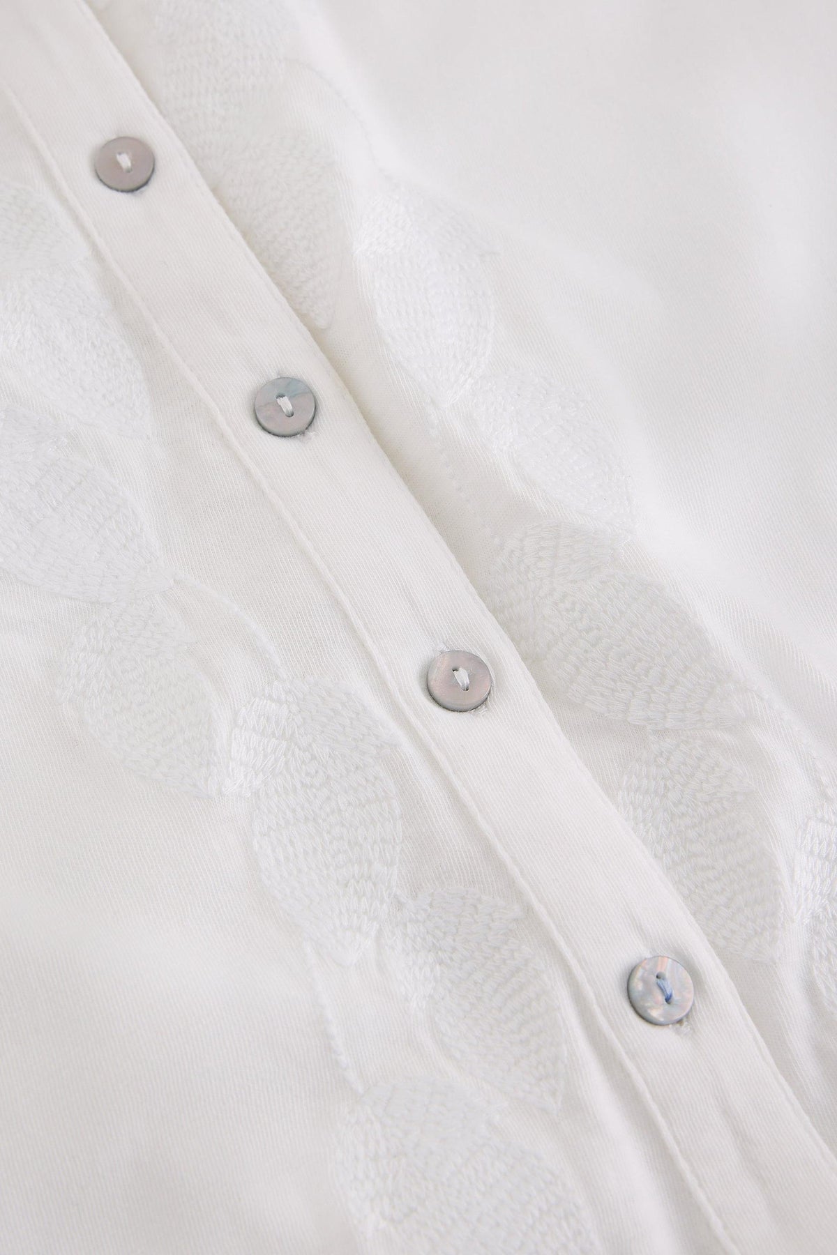 Close-up of embroidered white fabric with button details