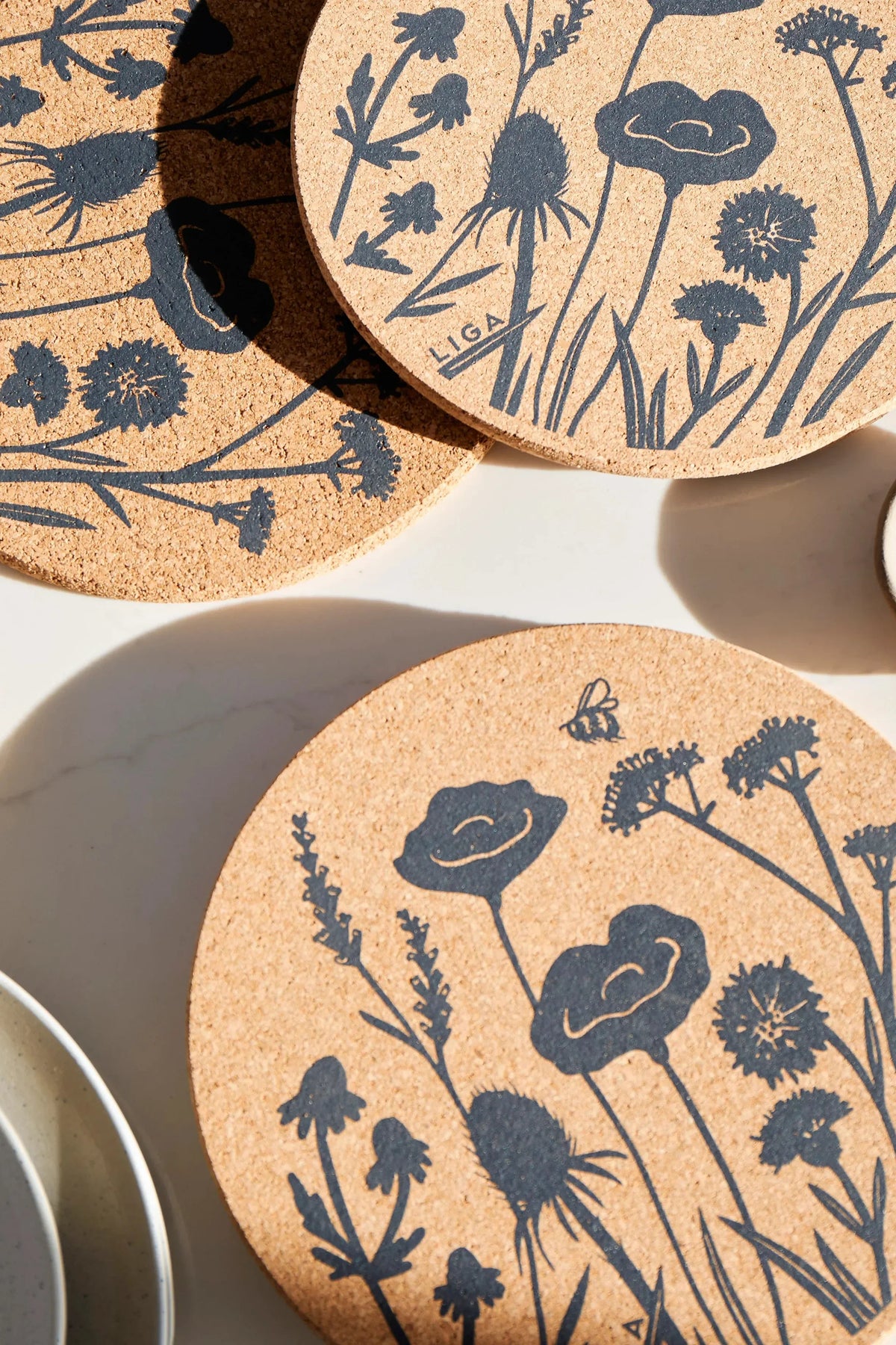 Cork coasters with floral designs on a light surface.