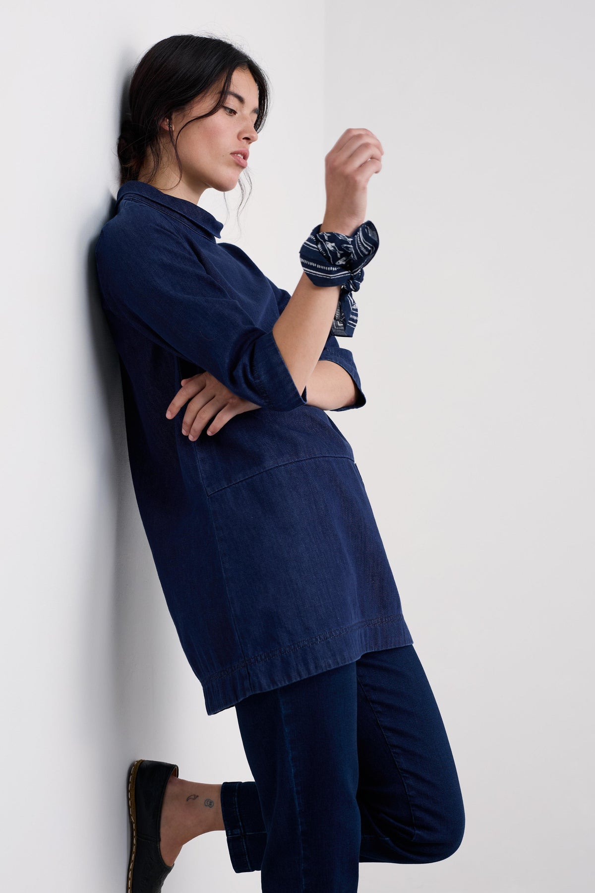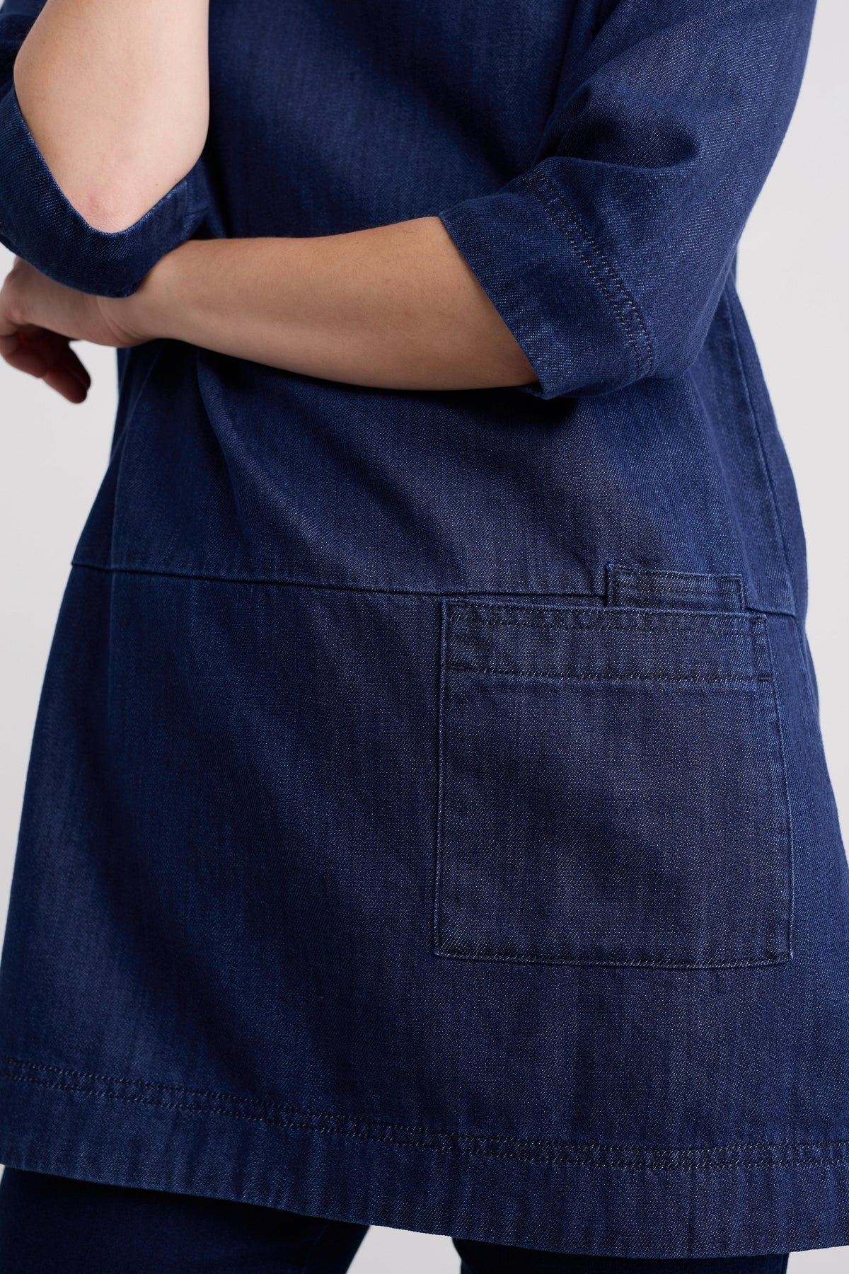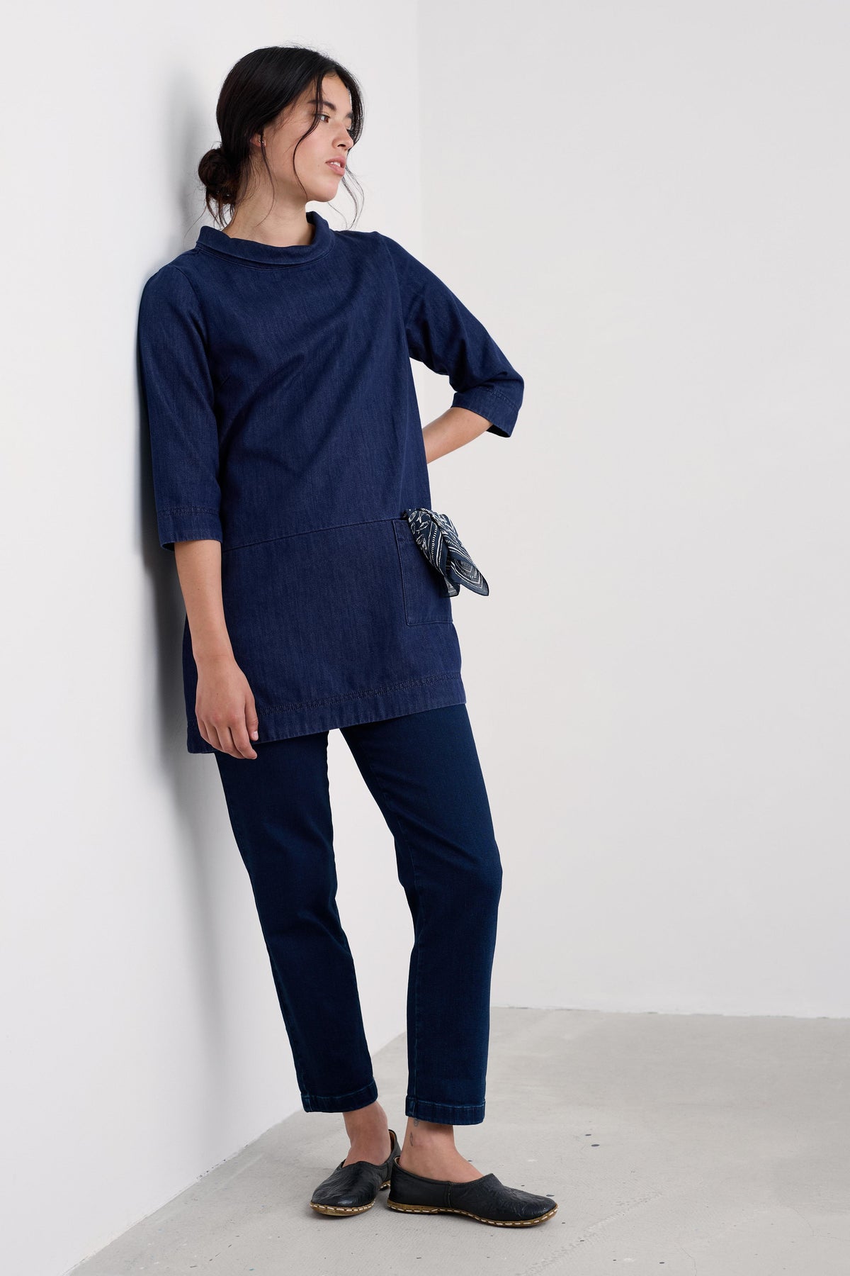 A versatile denim tunic crafted from soft organic cotton, designed for effortless style and comfort. The dropped waist creates an easy-fit A-line silhouette, while the roll-over cowl collar, patch pocket, and 3/4 cuffed sleeves add thoughtful, relaxed detailing.