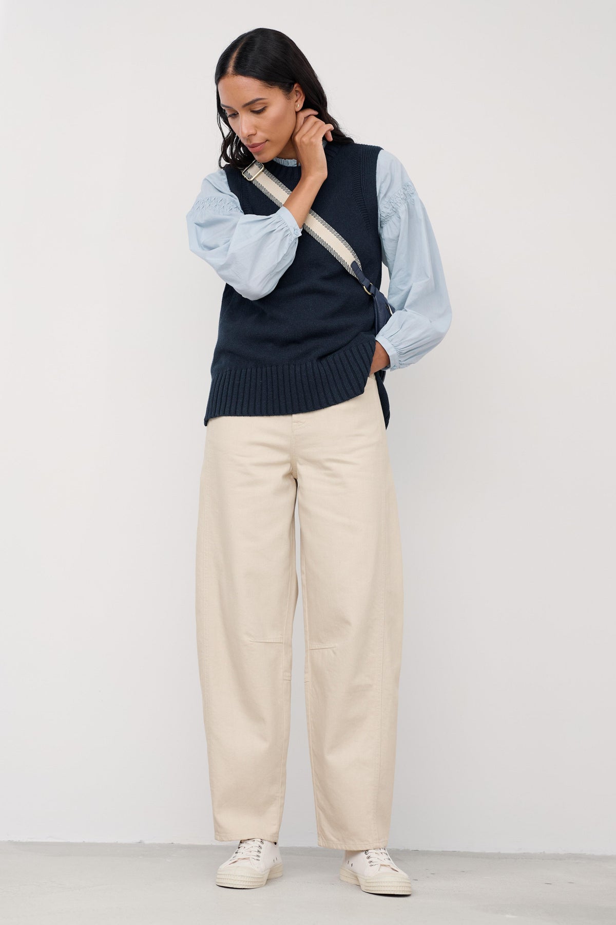 Woman wearing a navy sweater vest, light blue shirt, beige organic cotton pants, and white sneakers on a white background